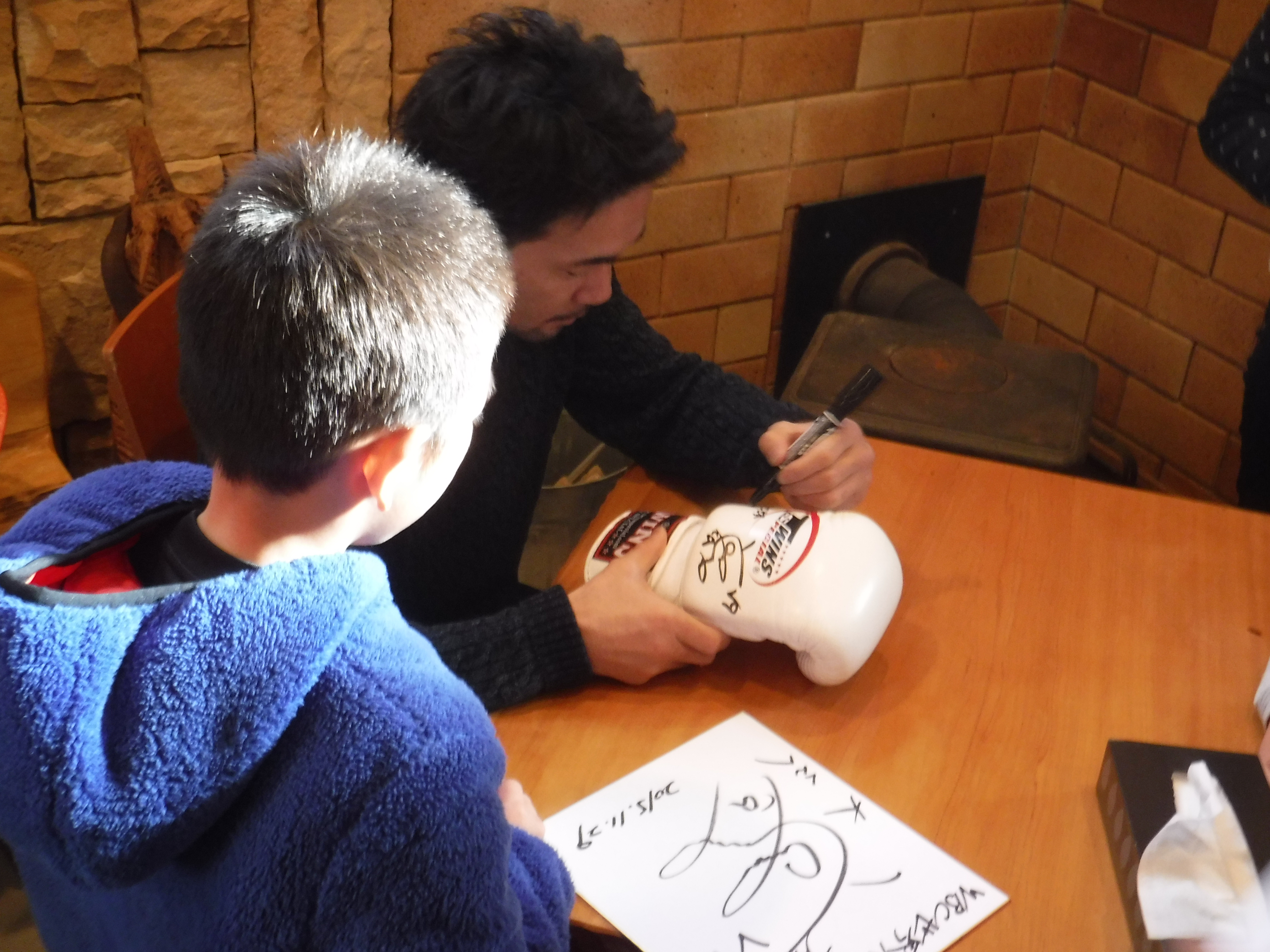 山中選手と初めてお会いしたぼく個人の感想ですが、ボクシング世界王者で有名な方だからと思って少し緊張しながら当日を迎えたんですが、いざ話してみるととっても話しやすくて、気さくな方でした。当日はたくさんの方が山中選手にサインを求められていましたが、どんな要望にも丁寧に応えられていて、ファンの方を楽しませていらっしゃいました。震災から4年半が経った今でも被災地をしてくださり、実際に来て地元の方と交流される山中選手の姿はとてもかっこよくて、尊敬します。僕も震災復興ボランティアの原点を見直す、一つのきっかけになりました。謙虚におごらず、相手の立場を考えることの大切さを、山中選手から学んだ気がします。