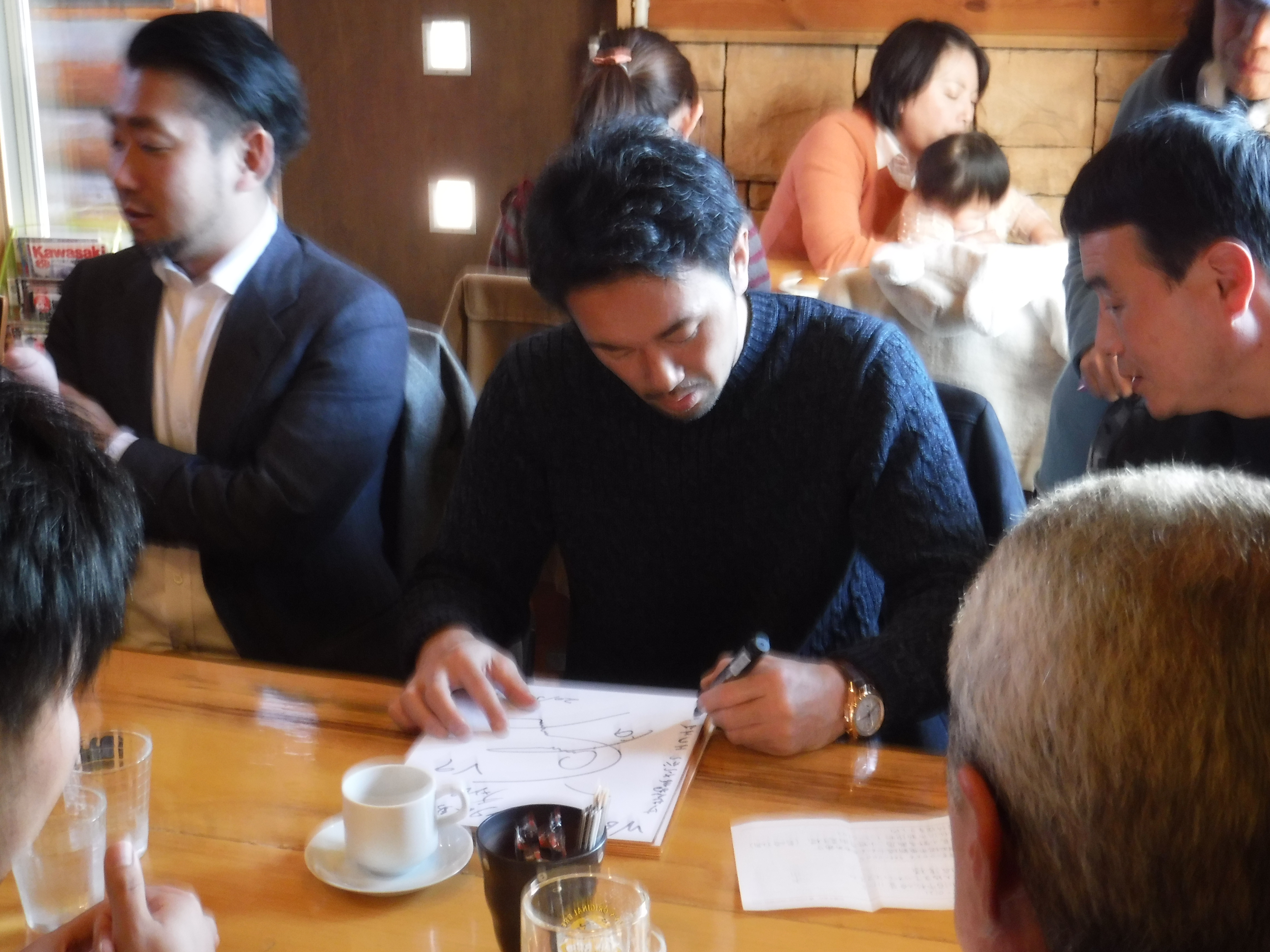 最後に、宮城野区蒲生地区にある「Cafe & Beer's bar impact」と言うお店にお邪魔して、山中選手とファンの方たちとの交流の時間を過ごしました。たくさんの方たちがサインや握手にこられ、交流を楽しんでいる様子でした。中には東北のジュニア部門チャンピオンの子が賞状をもってきて、賞状にサインをもらっていました。将来の神の左になるんでしょうか…!?