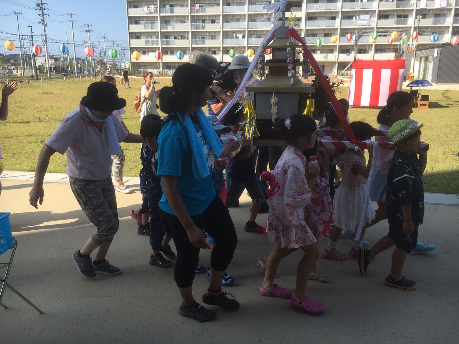 地元のおじいさん手作りの御輿を担いだ子供たちが、「わっしょい!わっしょい!」と元気よく復興公営住宅の周りを一周しました。