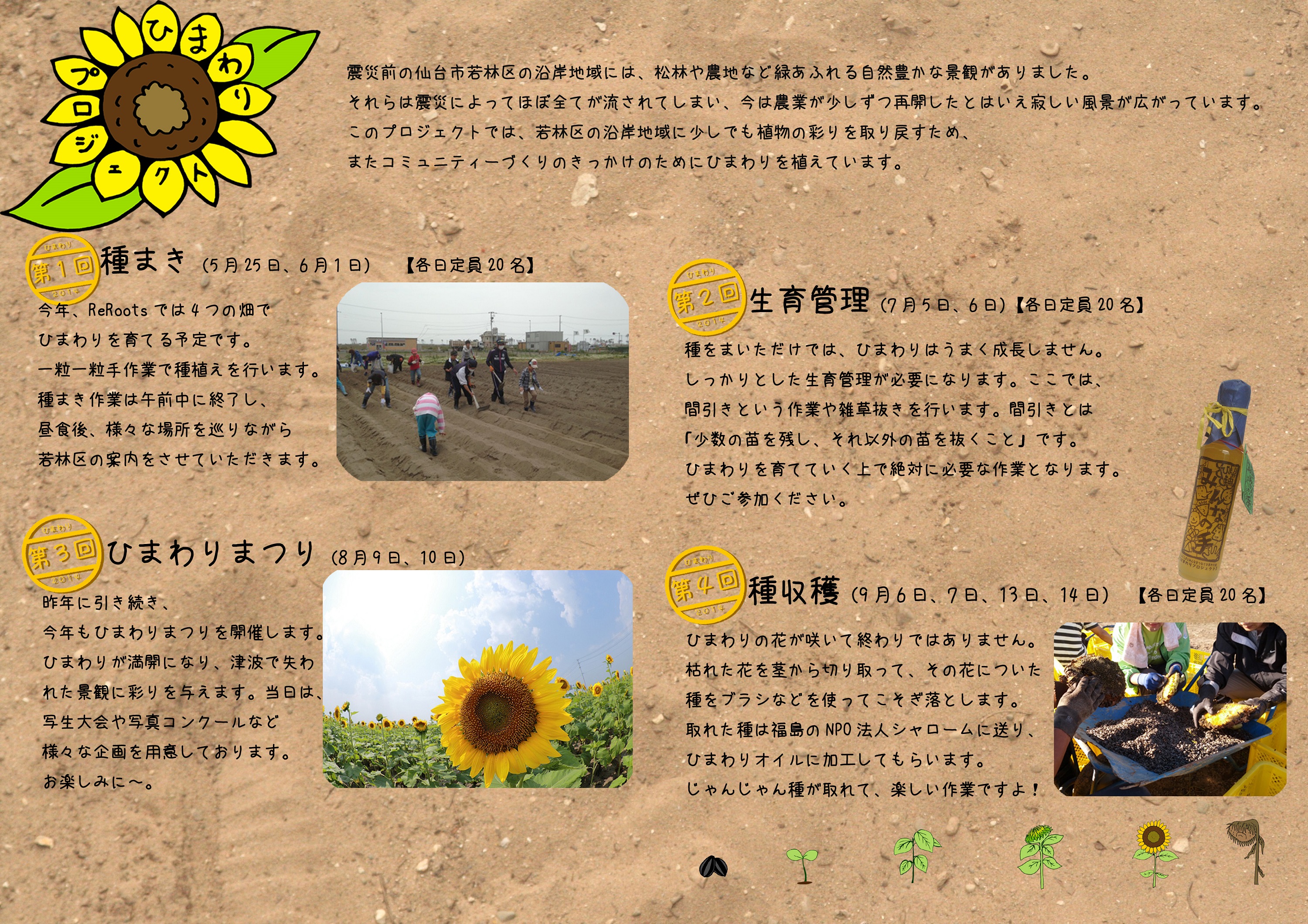 ReRootsは、東日本大震災による津波被災地の復旧から復興、更には地域おこしにむけて、仙台市若林区のボランティアハウスを拠点に活動する団体です。