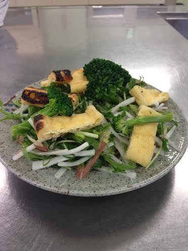 次はサラダそばです。この野菜の下にそばがあります。めんつゆだけでも周りの野菜がおいしいので十分食べごたえがありますが、ひまわりオイルをかけることによって深みが増してさらにおいしくなります。