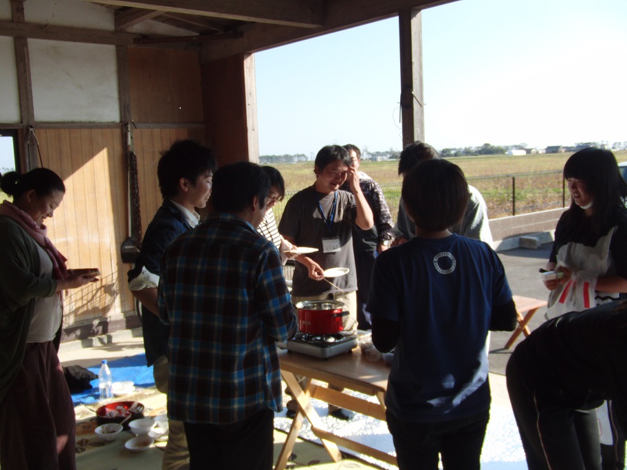 芋煮を食べながら、近所の方から震災の前の地区の暮らしや、震災当時の話などもお聞きしました。やはり、震災後土質が変わってしまい皆さん苦労されているようです。