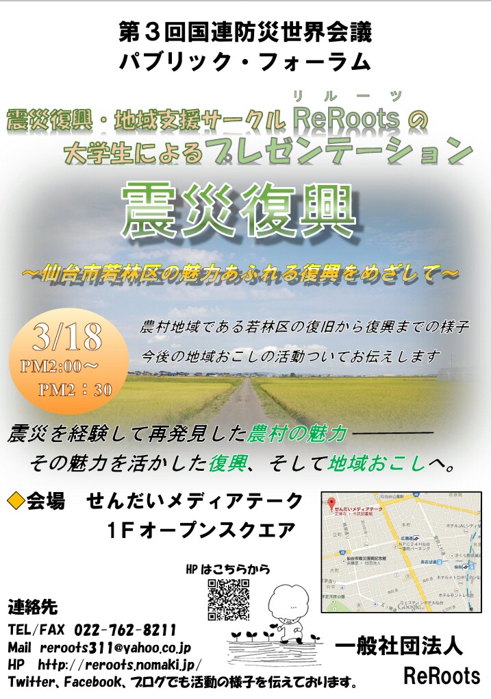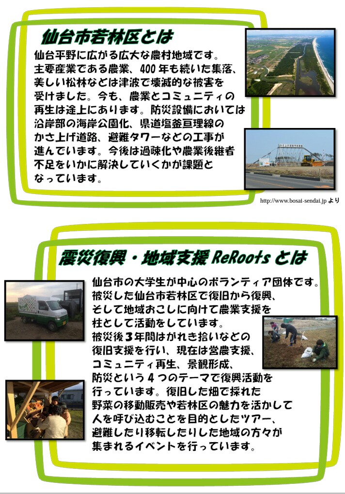 ReRootsは、東日本大震災による津波被災地の復旧から復興、更には地域おこしにむけて、仙台市若林区のボランティアハウスを拠点に活動する団体です。