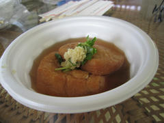 「に」は荒浜で作られる分厚い油揚げを使った伝統料理のことで、今回は100食を用意したのですが、なんとたった30分で配り終えてしまうほどの人気ぶり…