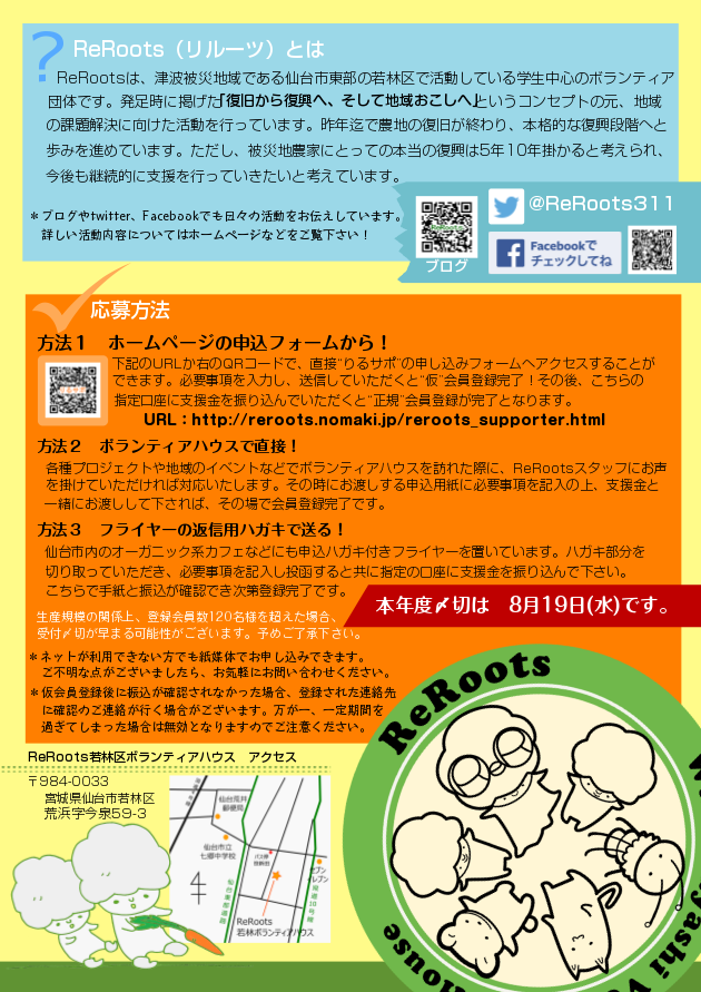 リルーツサポーター会員制度、略して“りるサポ”は、活動を維持するための資金確保と、サポーターの皆さんに若林区の様子を伝えることを目的として、昨年度始まったばかりの制度です。