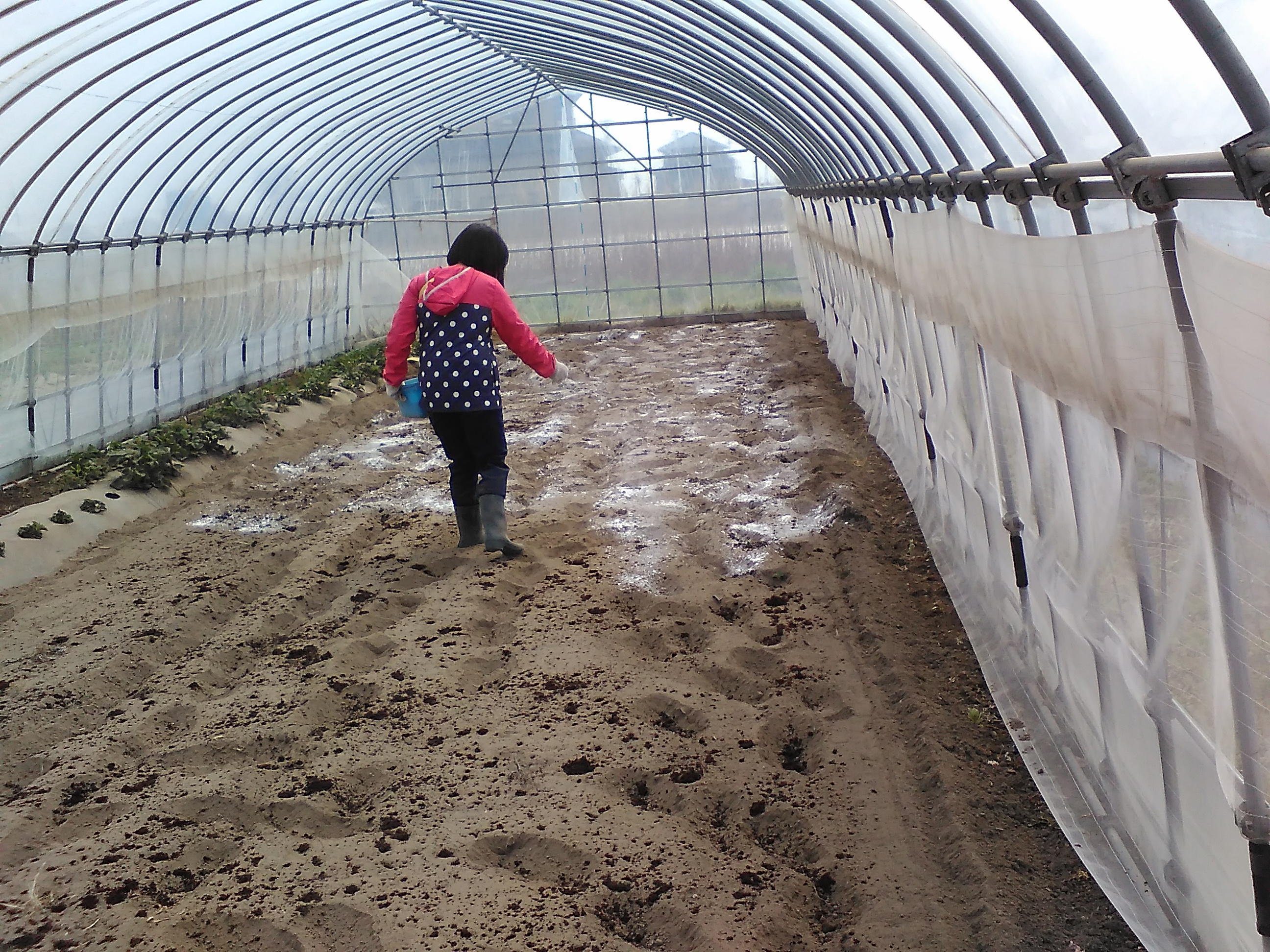 オクラの土作りでは、発酵牛糞と石灰をまきました。