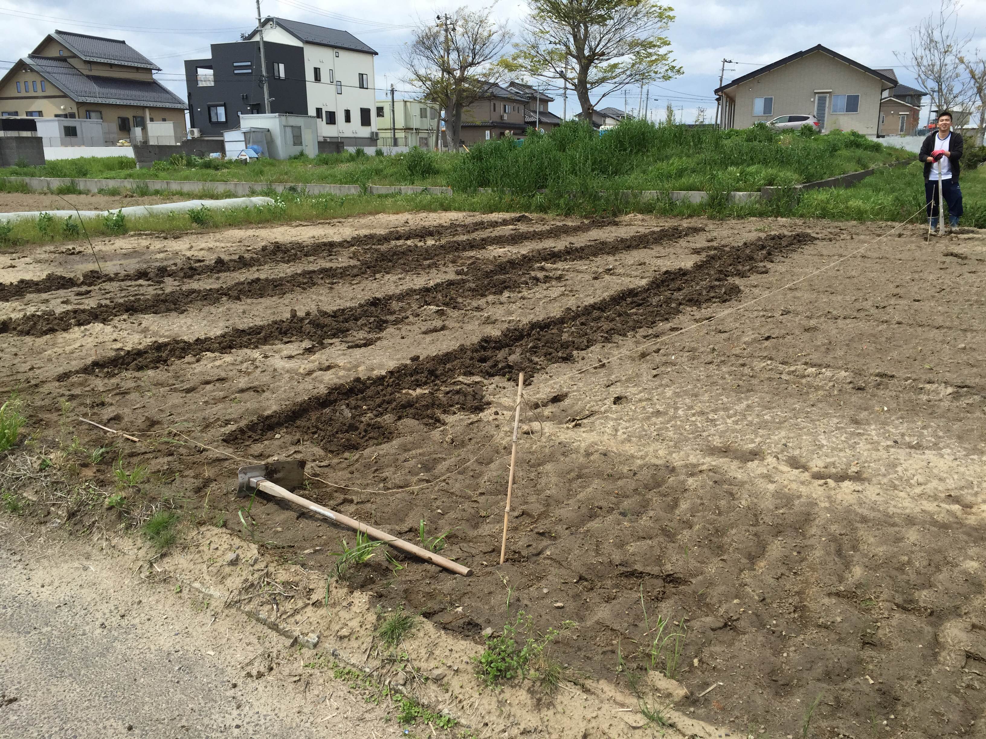 雨が降ったりやんだり、水がはけなくて畑に入れない日が続きましたが、土づくりと畝たてが完了しました!