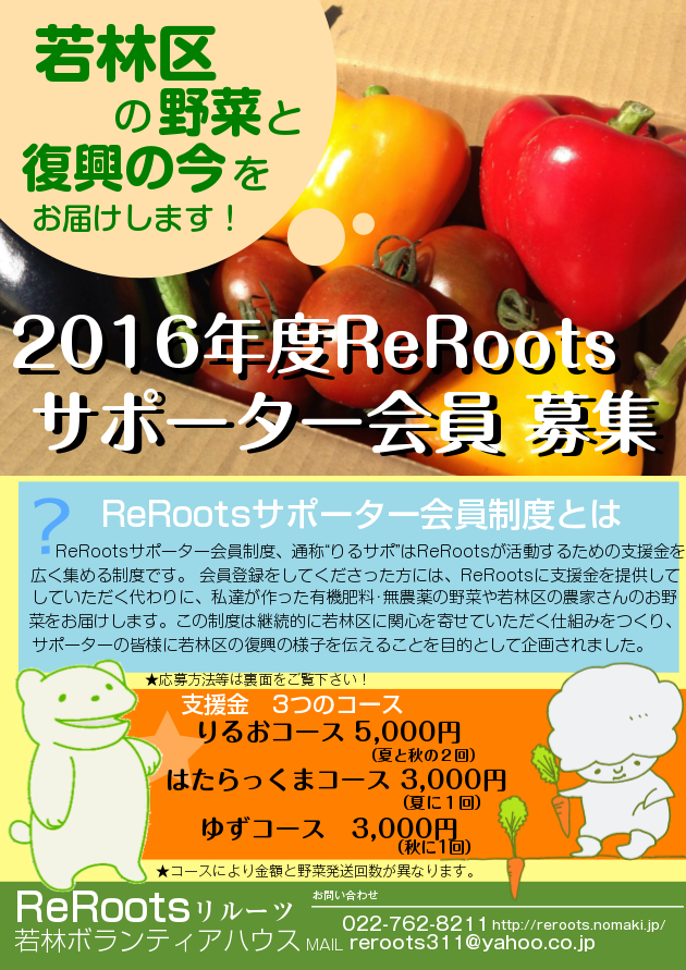 ReRootsは、東日本大震災による津波被災地の復旧から復興、更には地域おこしにむけて、仙台市若林区のボランティアハウスを拠点に活動する団体です。