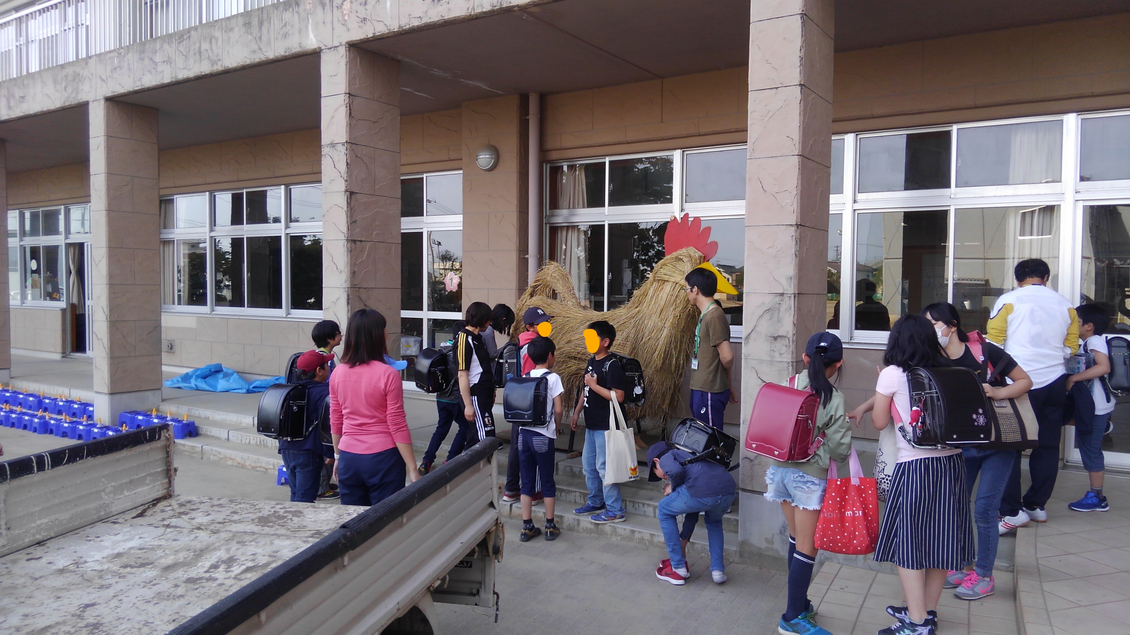 七郷小学校の昨年の4年生(今年の5年生)が刈り取った稲わらを使った鶏を七郷小学校に運んできました。