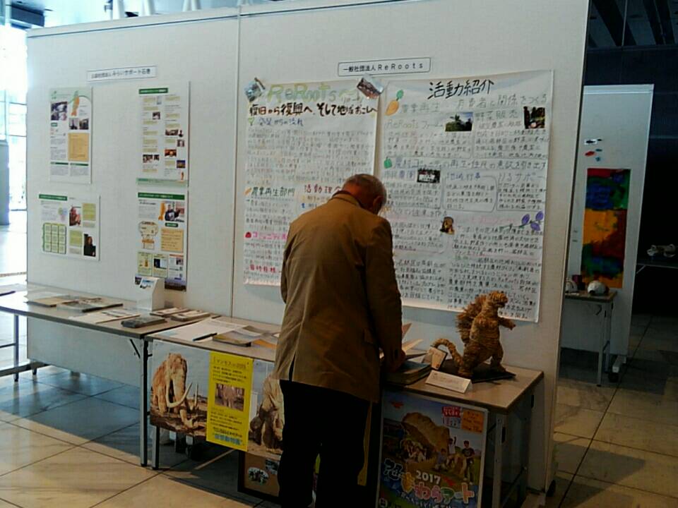また、報告会とは別に各団体模造紙やリーフレットなどを展示するコーナーもありました。ReRootsからは団体のリーフレットのほかにわらアートのゴジラ(体長50cm)や今年の絆力の助成を受けて作成した今後の取り組みの方針を提言するパンフレット、笹屋敷町内会から依頼を受け作成した震災の記録集、を展示しました。政策パンフや記録集、リーフを手に取ってくれてた方が多々見られたことは嬉しかったです!