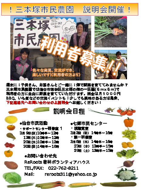 市民農園では、まだ空き区画がございます。興味のある方はぜひReRootsまで