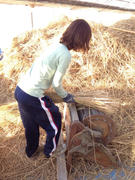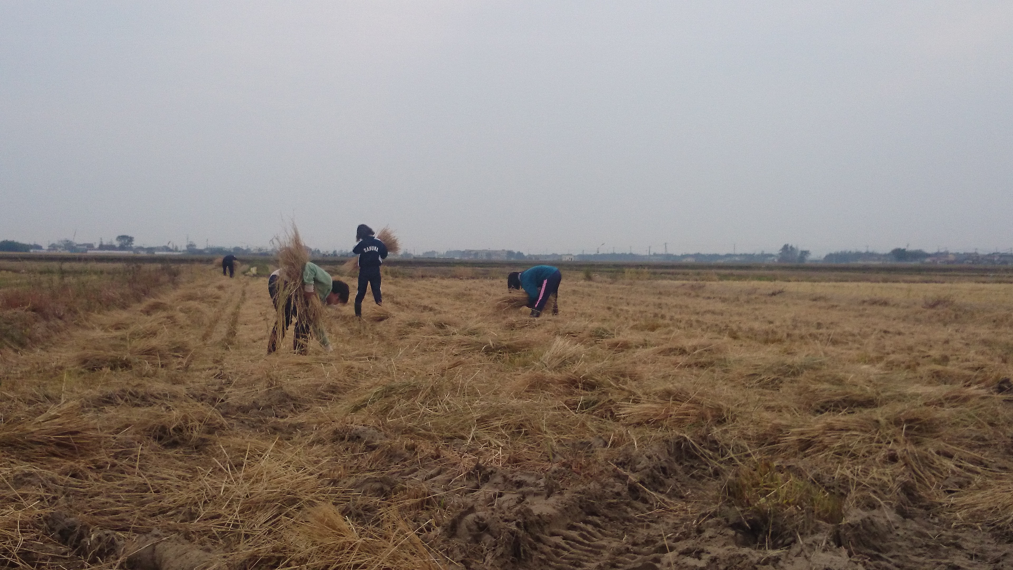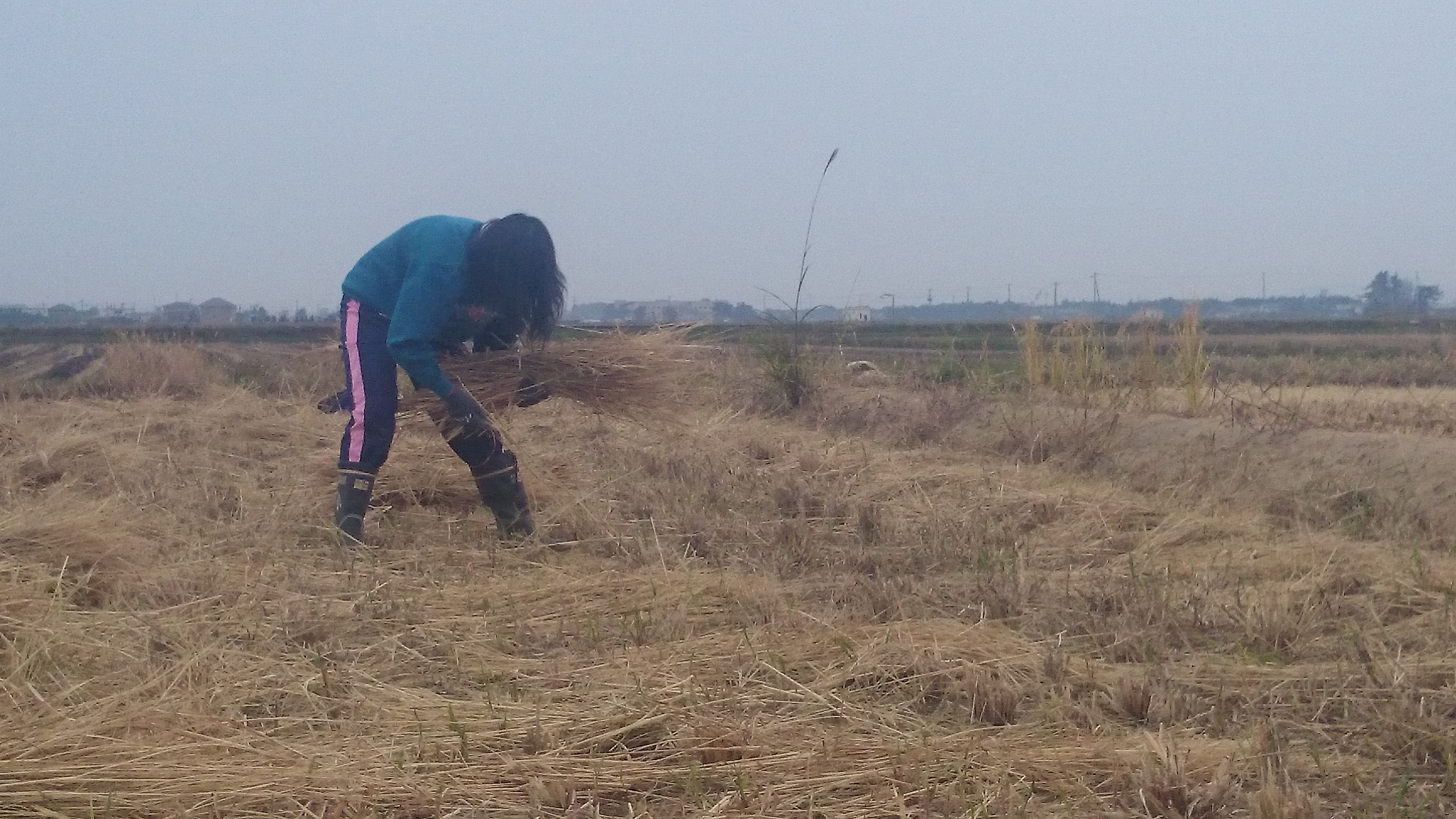屈んでの作業はみため以上に重労働。コンバインがないころは、こうやって藁を全部束ねてかさがけの様に干していたことを省みると、農家さんの大変さがうかがえます。