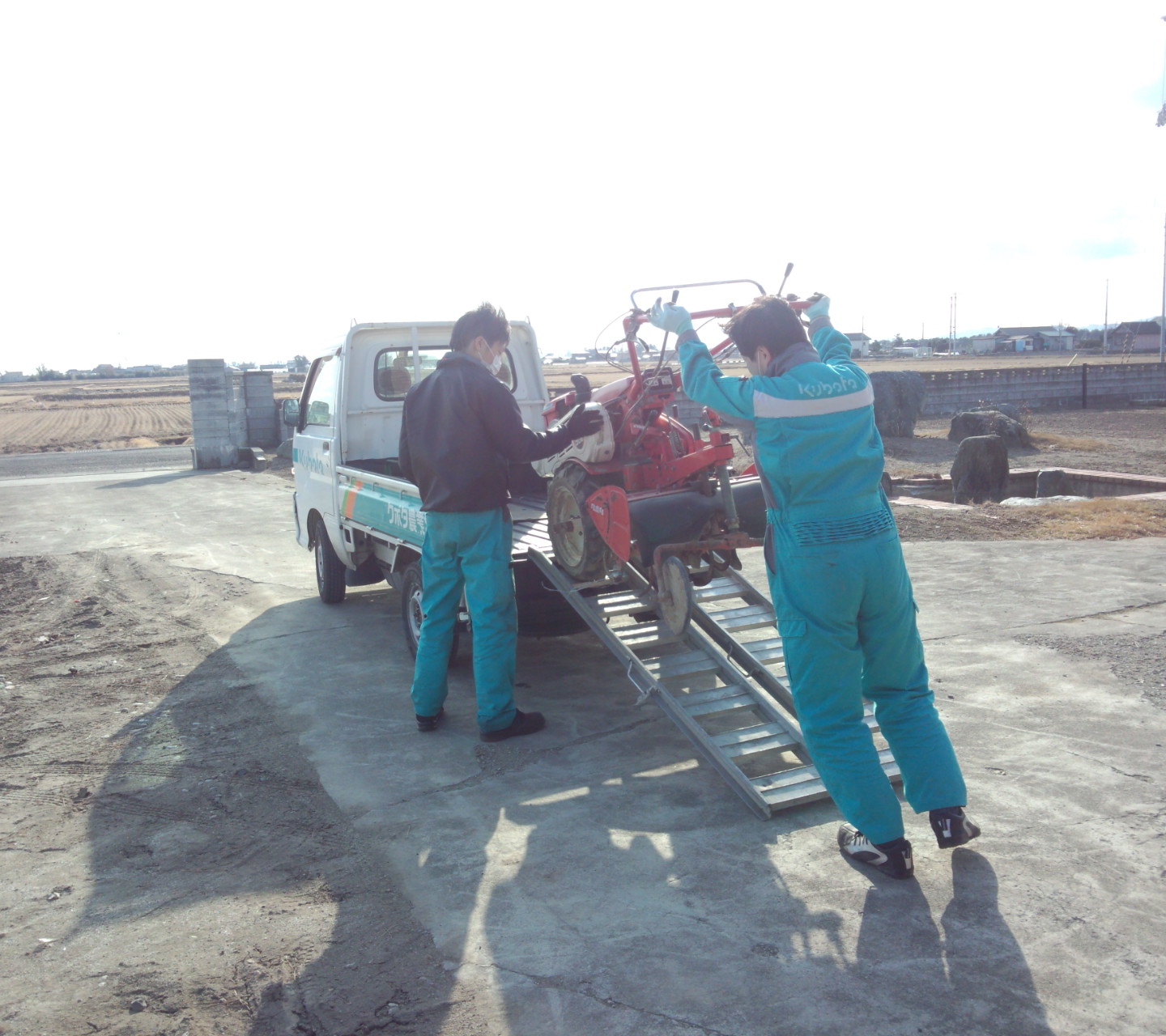 震災の影響をうけた機械は塩水をかぶって、エンジンをいくら掃除してもすぐダメになってしまうことが多いみたいです。また、震災後、中古でトラクターを買いなおされる方が多く古い型のものもどんどん出回っているというお話をお聞きしました。