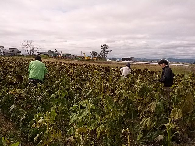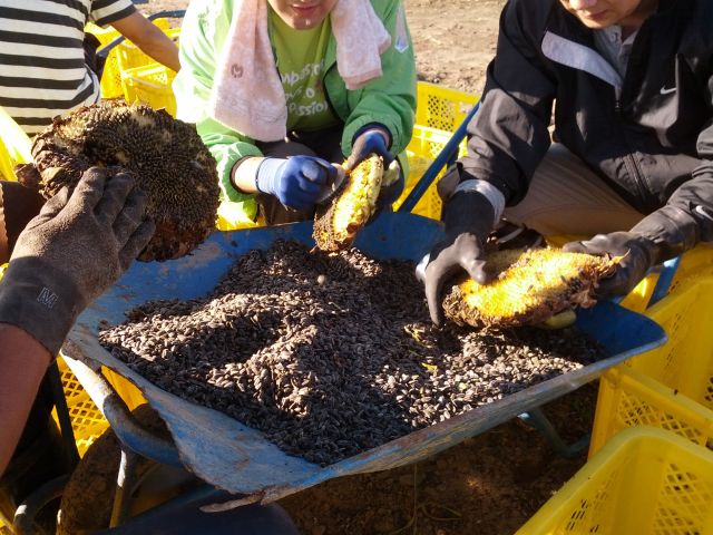 今日は土嚢袋に約10個分のひまわりの種が取れました。ですが、まだまだ終わりません。