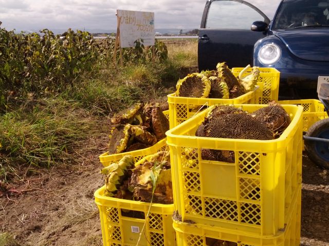 そんなこんなで、コンテナにいっぱいのひまわりの顔…というとなんか痛々しいですが(顔だと考えたらすごく自分が残虐に思えてきました)、花が取れました。1tトラックに山盛り1杯と、コンテナ数十個分です。