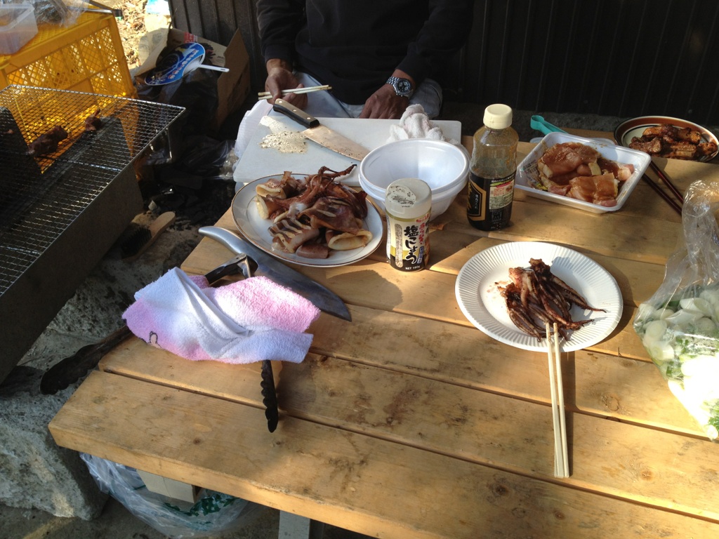 そして、作業の後、農家さんにあいさつしにお家の前まで行ってみると、何やらおいしそうなものが机に並んでいて、その横には、ひとり金網でイカを焼く農家さんの姿が…笑