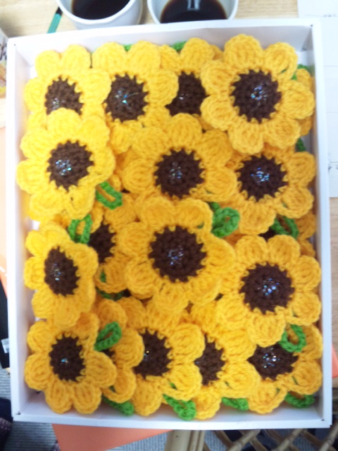これは、復興風船の製作者の方がReRootsメンバーのために作ってきてくださった、ひまわりのワッペン?のような飾り物です。なんとその数40個!今日持ってきてくれました。ありがとうございます。