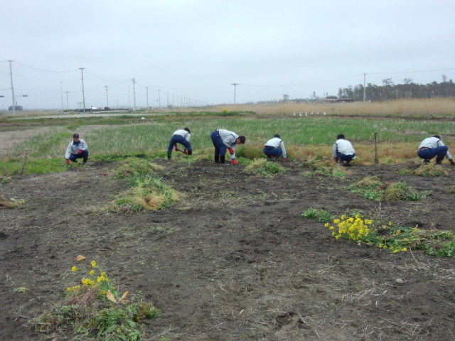 昨日は、福岡県からいらっしゃった西部ガス野球部のみなさんと、二木地区の畑の草取りとビニールハウスの中のガレキ取りをしました。