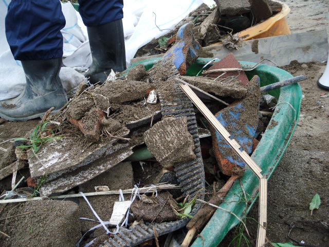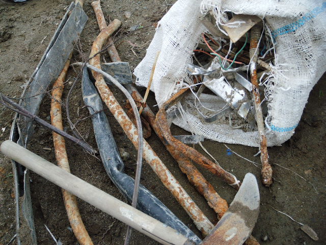 ここの畑のがれきからは瓦・ガラス類・プラスチックなどの人工物が多いという印象を受けました。ガラスはとても細かいけれど、60㎝ほどある金属の棒や板もゴロゴロと存在しました