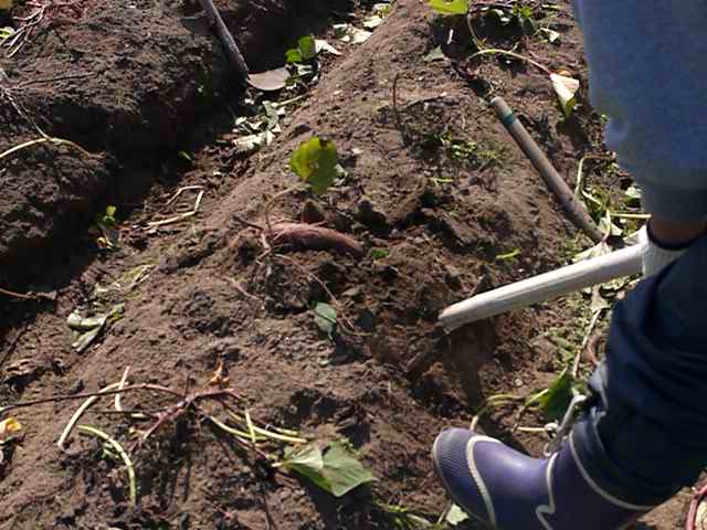 つるを刈って、土が見えたら、土をスコップで掘り起こします。