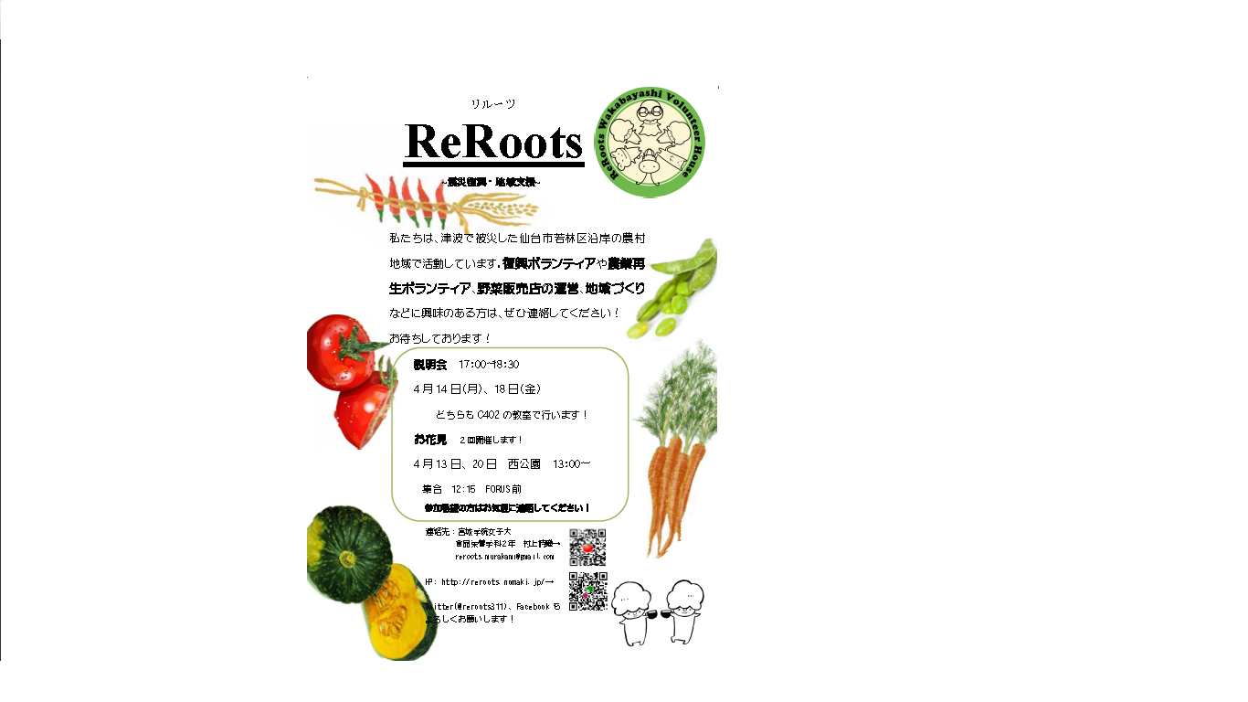 ReRootsは東日本大震災をきっかけに作られた、震災復興・地域支援をしているサークルです。
