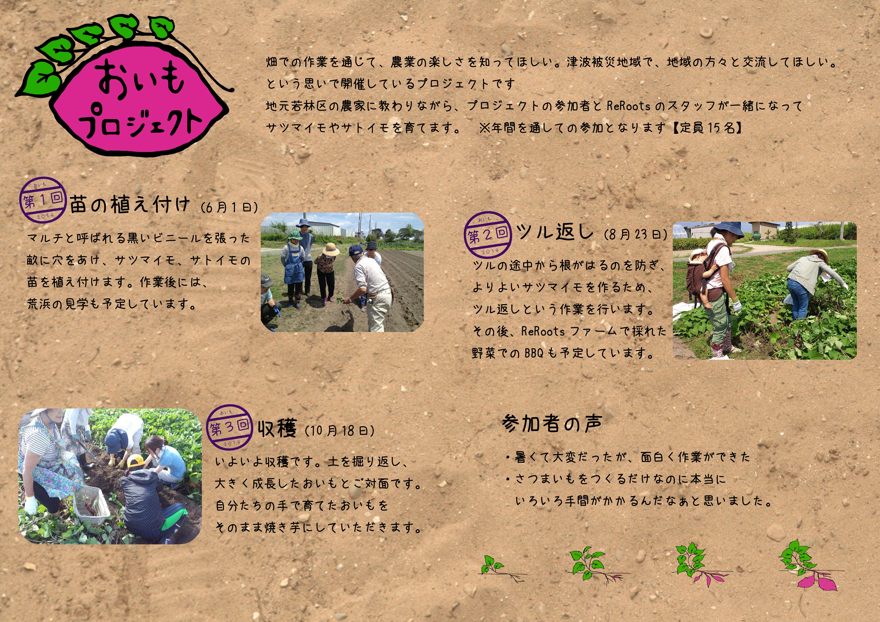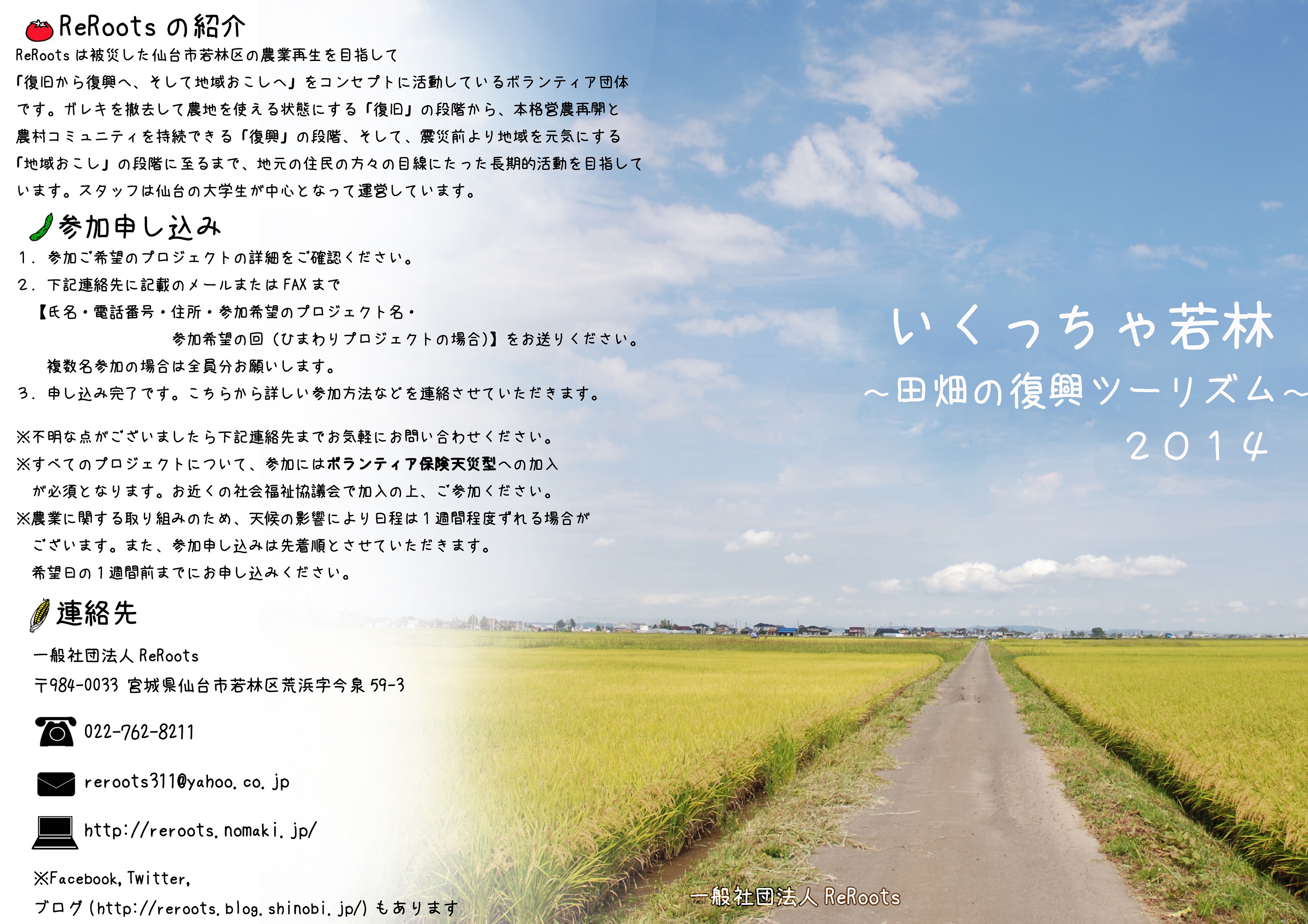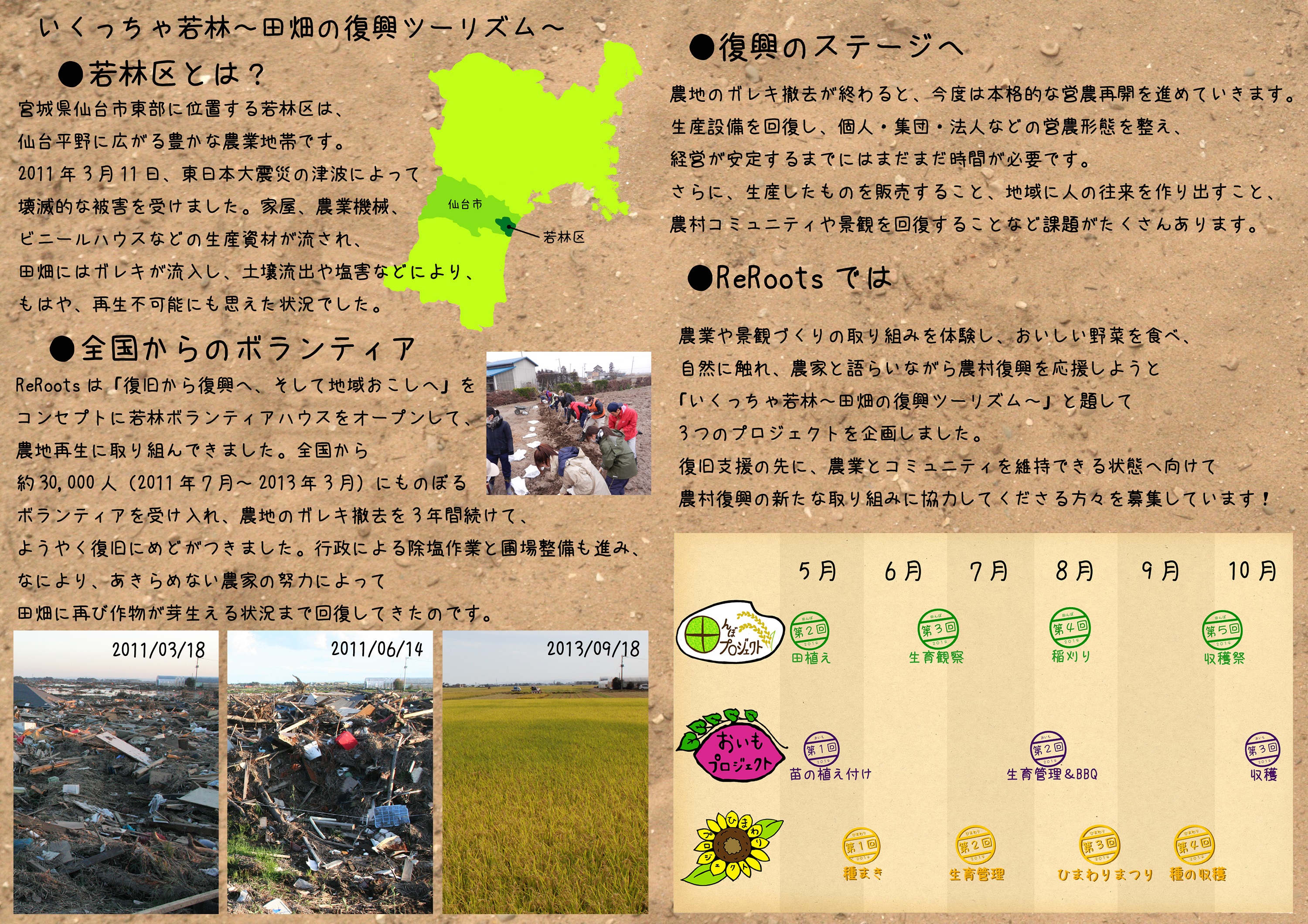 ReRootsでは農業や景観づくりの取り組みを体験し、おいしい野菜を食べ、自然に触れ、農家と語らいながら農村復興を応援しようと「いくっちゃ若林~田畑の復興ツーリズム~」と題して3つのプロジェクトを企画しました。