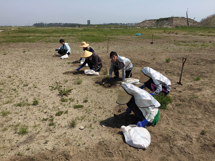 今日も、リルーツの活動に興味を持って体験ツアーに参加してくれた新入生たちと一緒に畑のガレキ拾いを行いました!