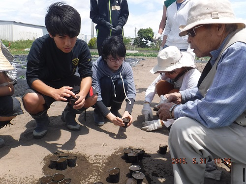 ポットに枝豆の種をまきます。8月末にはこの枝豆を収穫して料理するイベントを開催します。