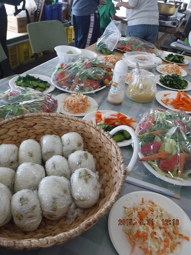 お昼にはロールキャベツやコールスローサラダ、豆ごはん、お漬物…。地元野菜をたっぷり使った色とりどりの料理が並びます。