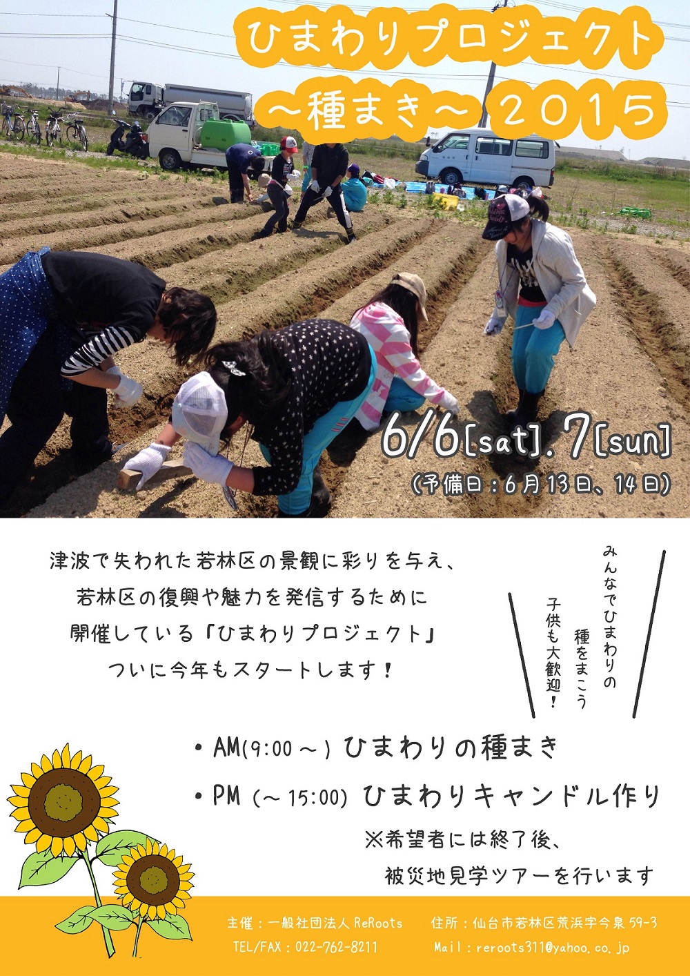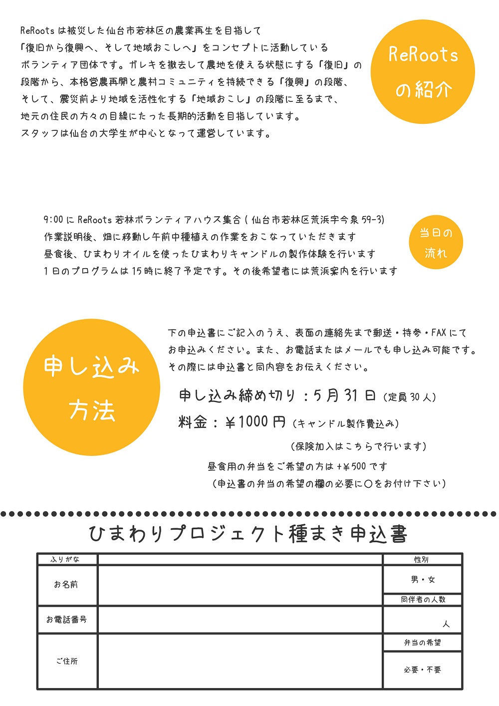 ReRootsは、東日本大震災による津波被災地の復旧から復興、更には地域おこしにむけて、仙台市若林区のボランティアハウスを拠点に活動する団体です。