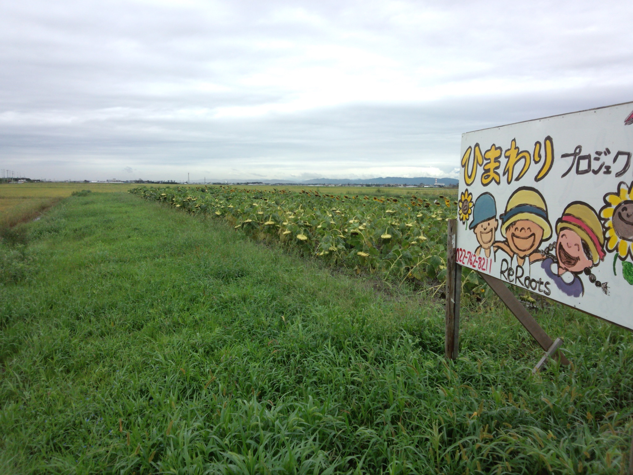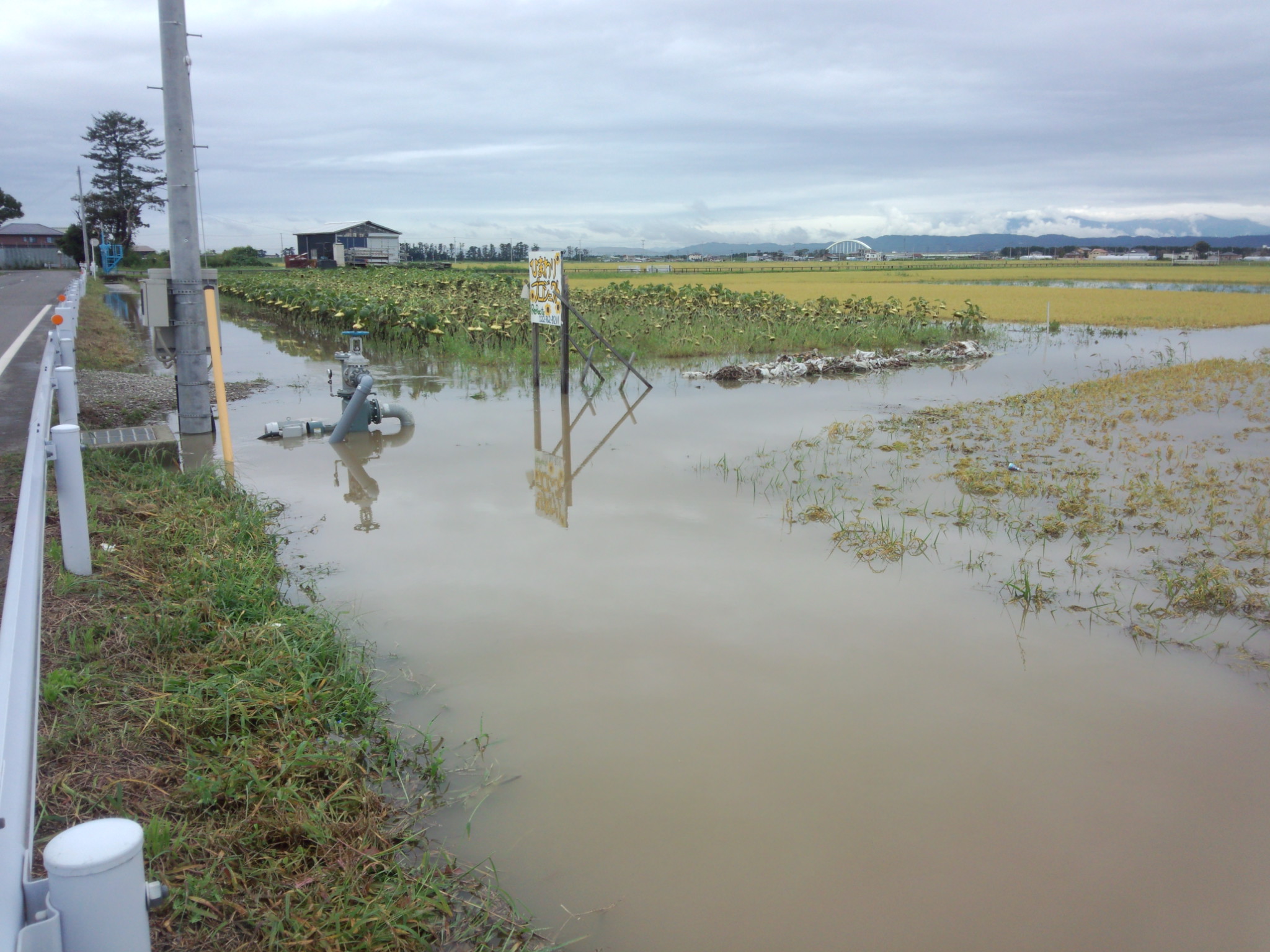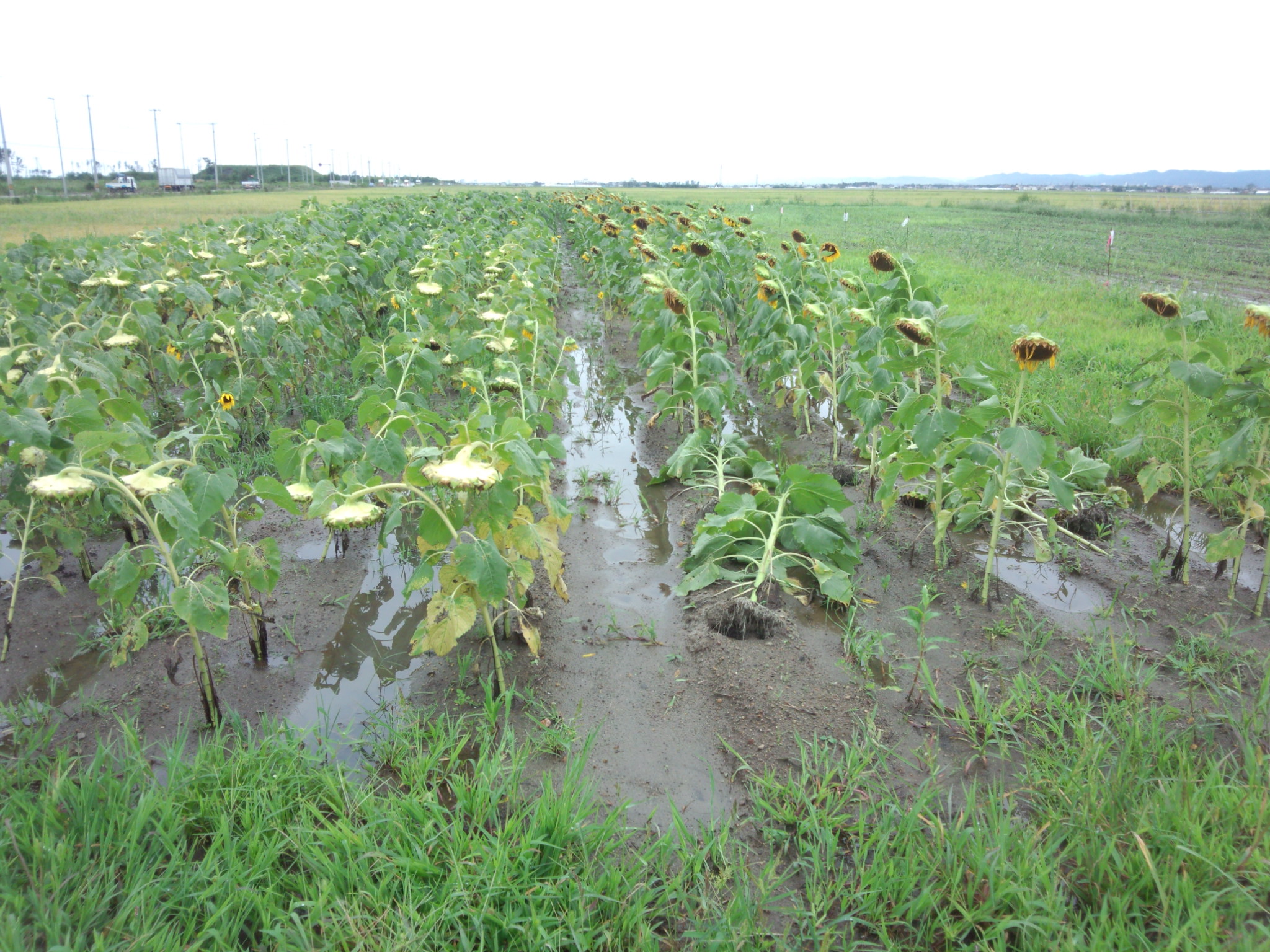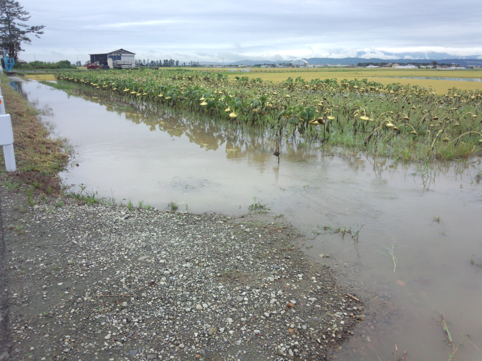 二木のひまわりプロジェクトは、畑の脇を流れる水路があふれていて、ひまわり畑は冠水していました。左の写真をみると、手前に頭だけ見えているのは稲穂です。冠水のレベルが高い場所です。