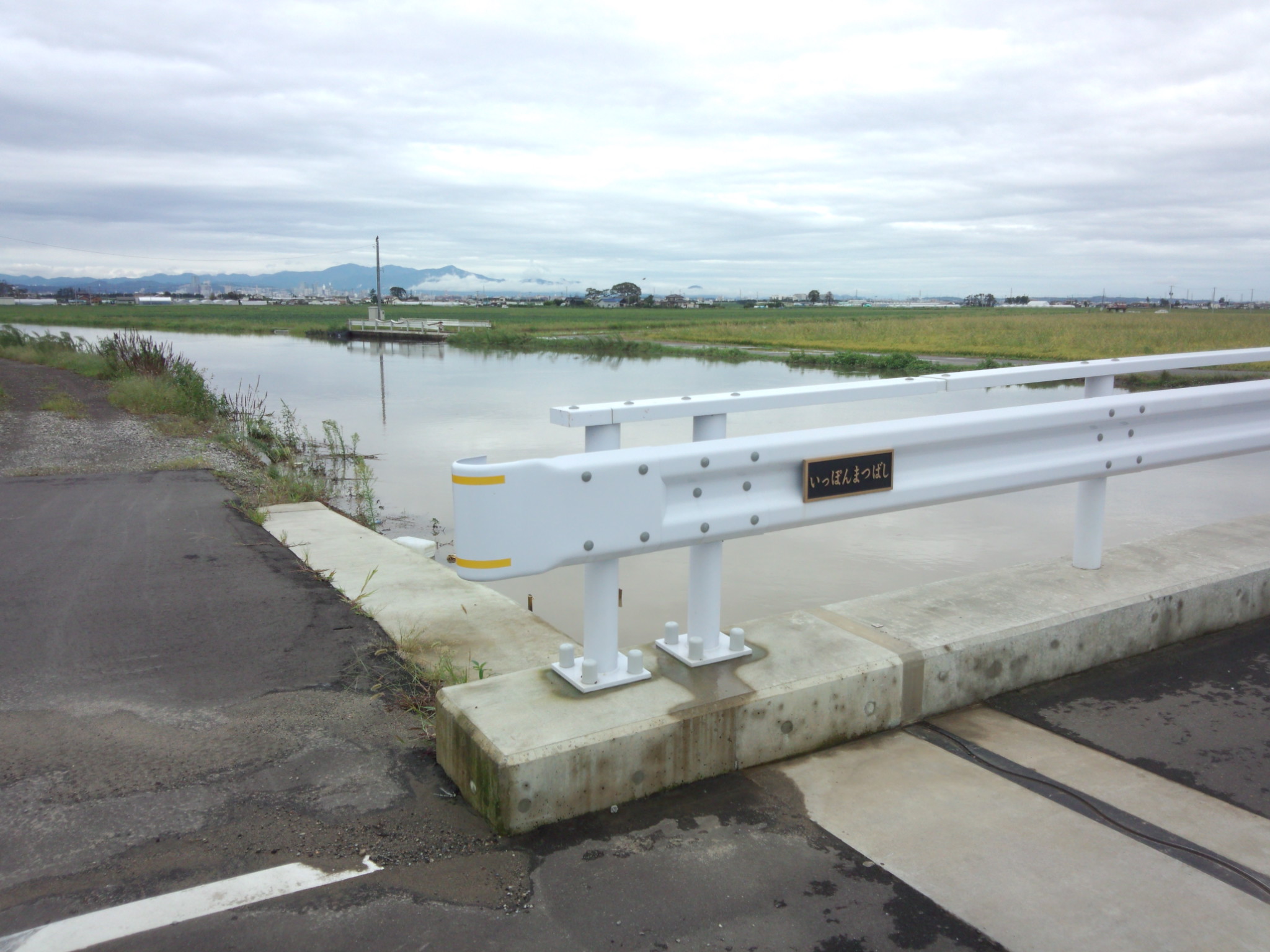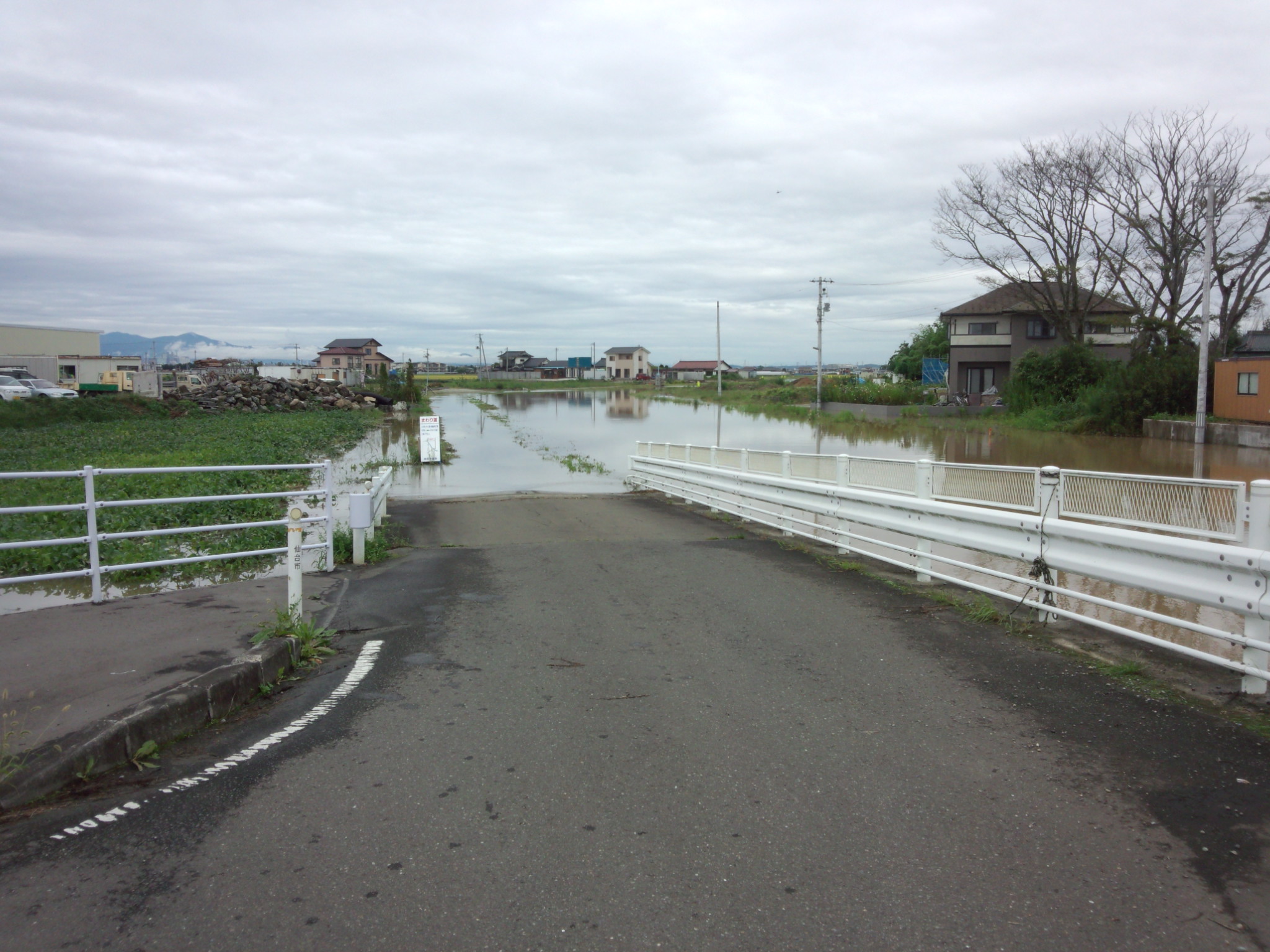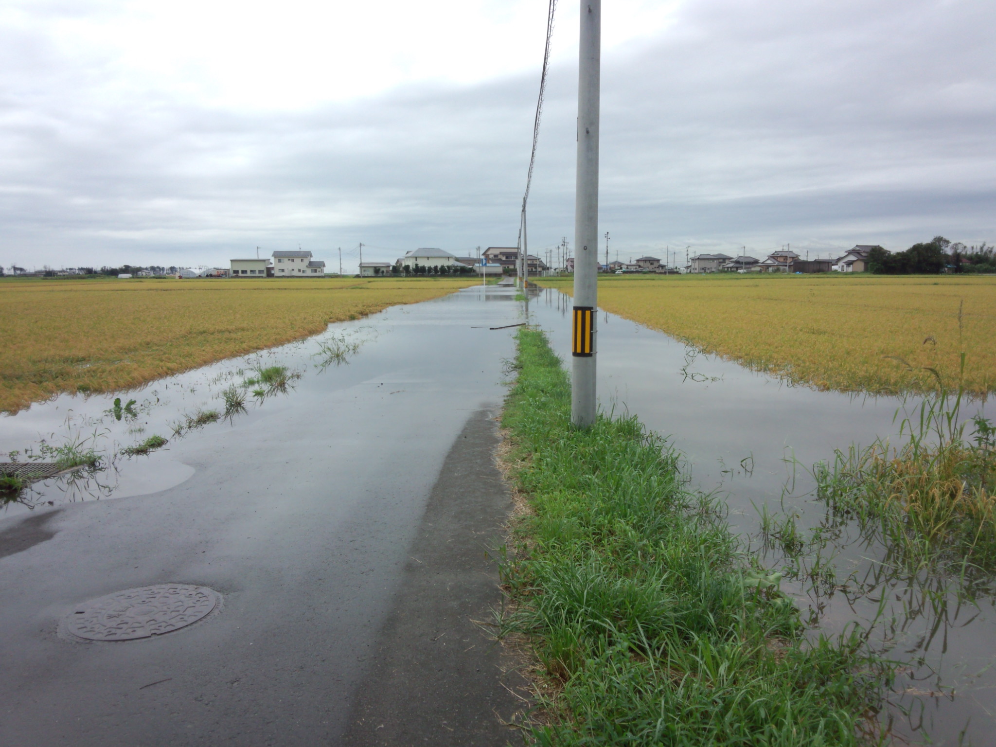 田んぼに面して低い道路部分は冠水。
