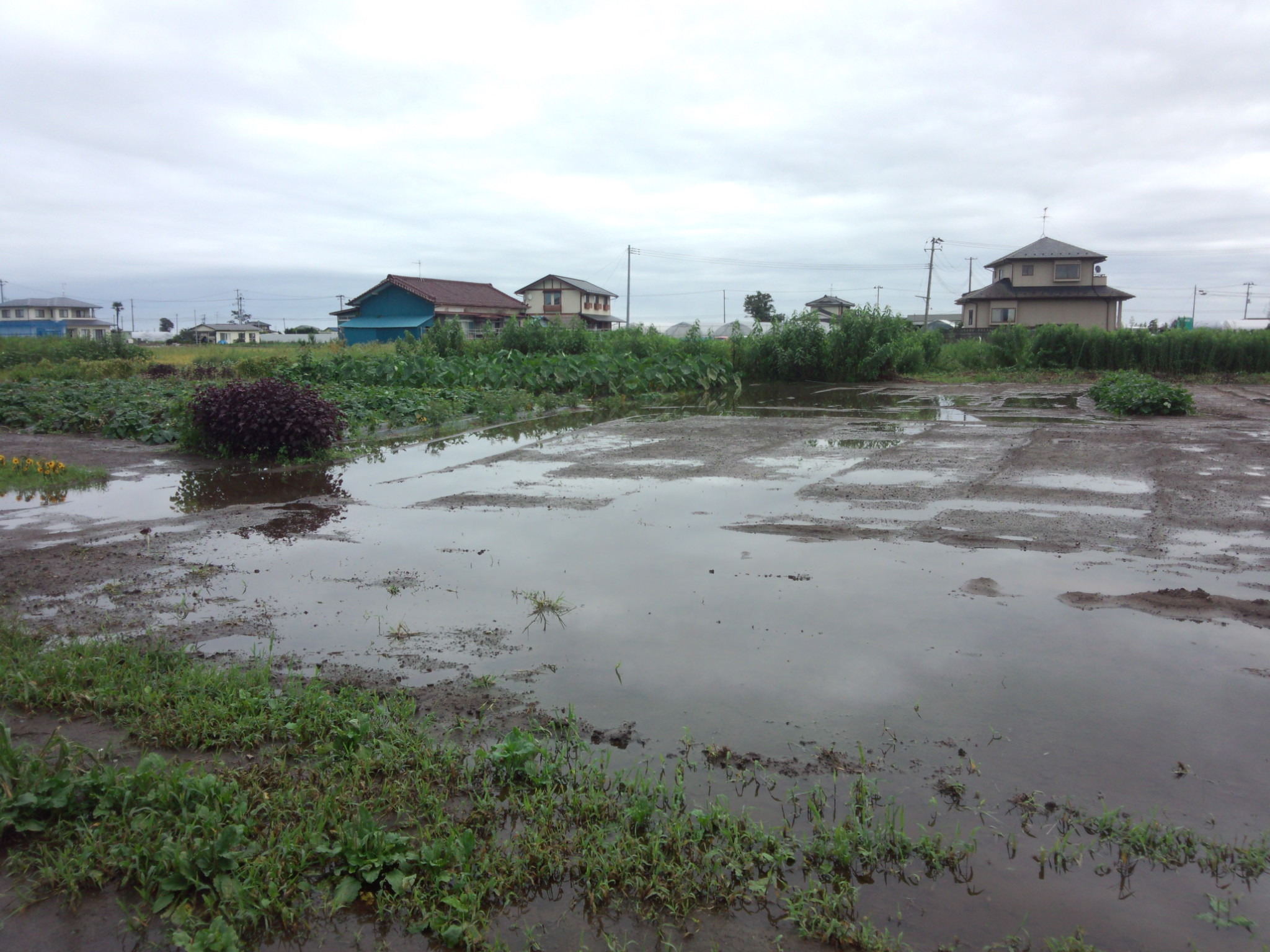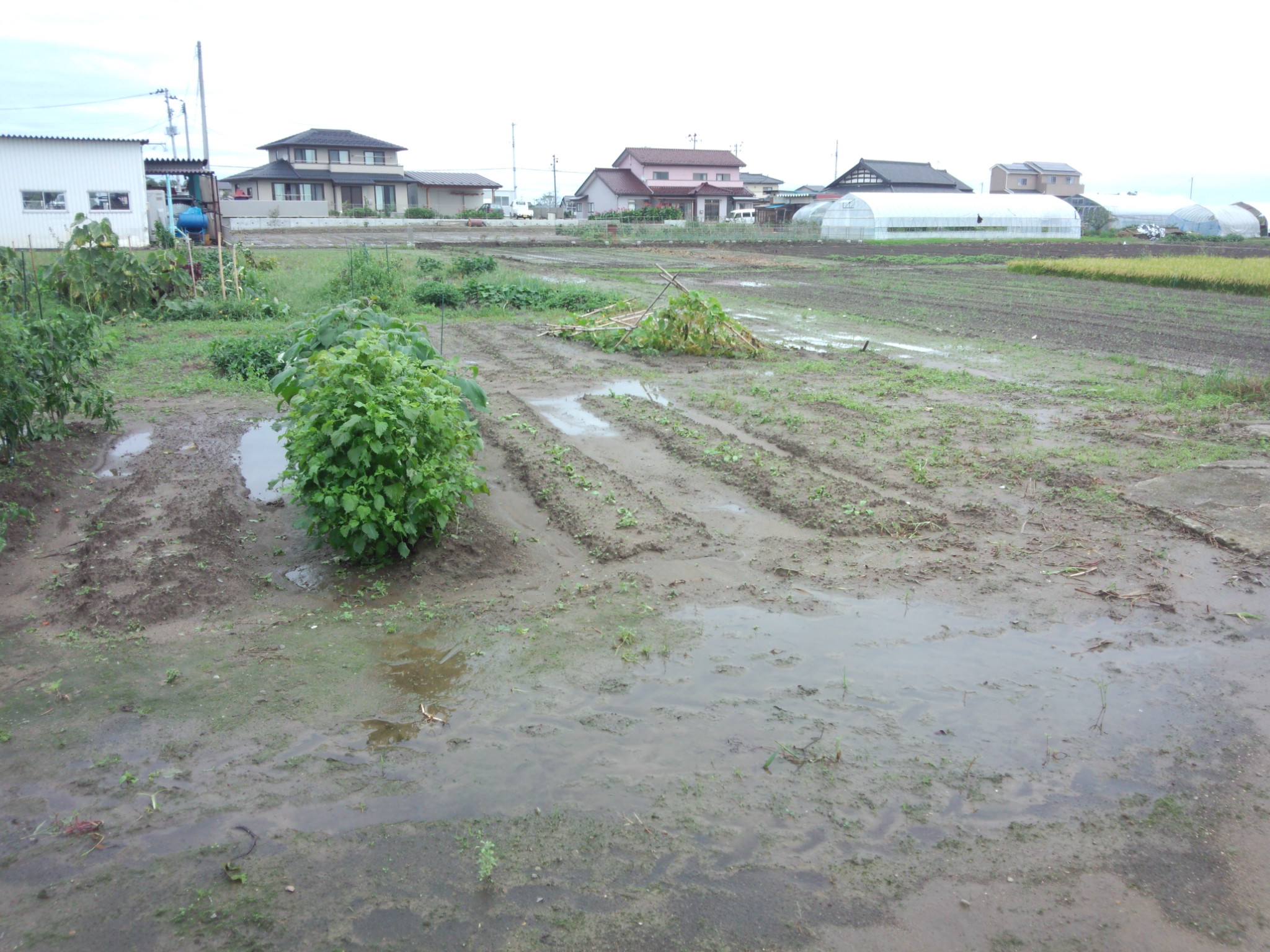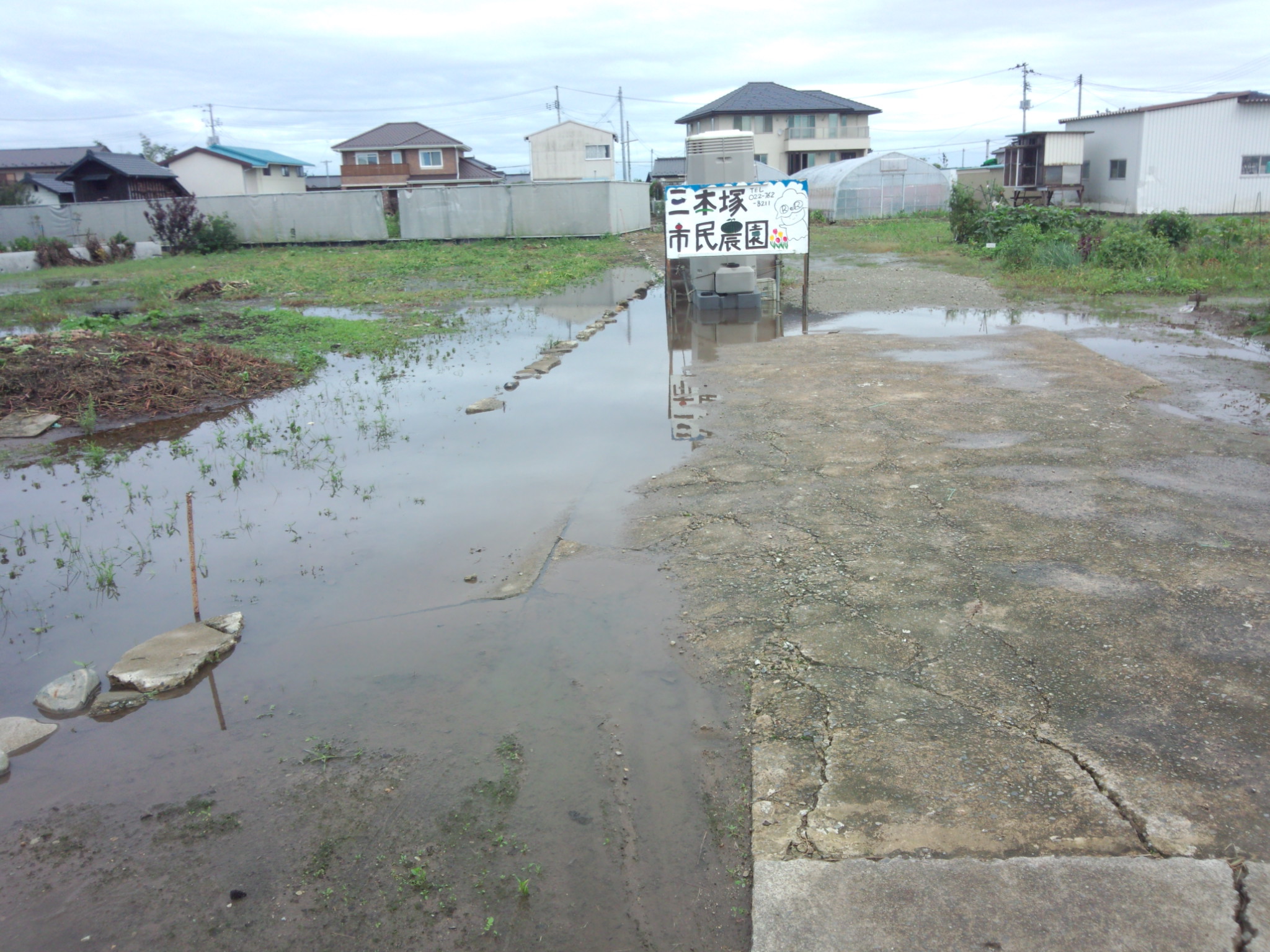 三本塚市民農園にも水たまりが広範囲にできています。写真右の奥の方にある支柱は倒れてしまいました。
