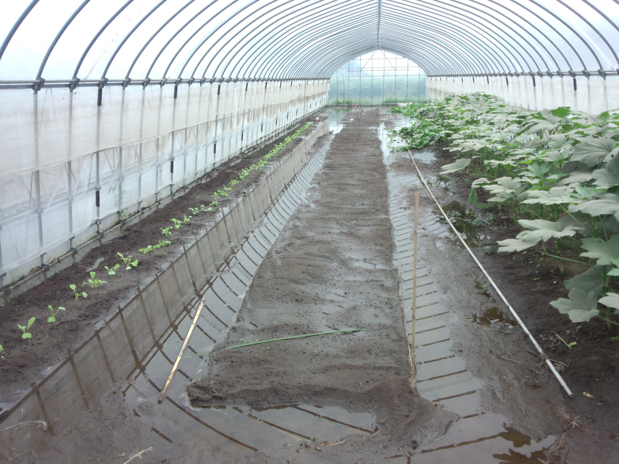 ReRootsファームも大きな水たまりがあり、ビニールハウスのなかにまで出来ています。