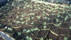所々1つのポットからいくつも生えているところがあるのはご愛嬌ですね。土が乾いたら、間引きして定植します。