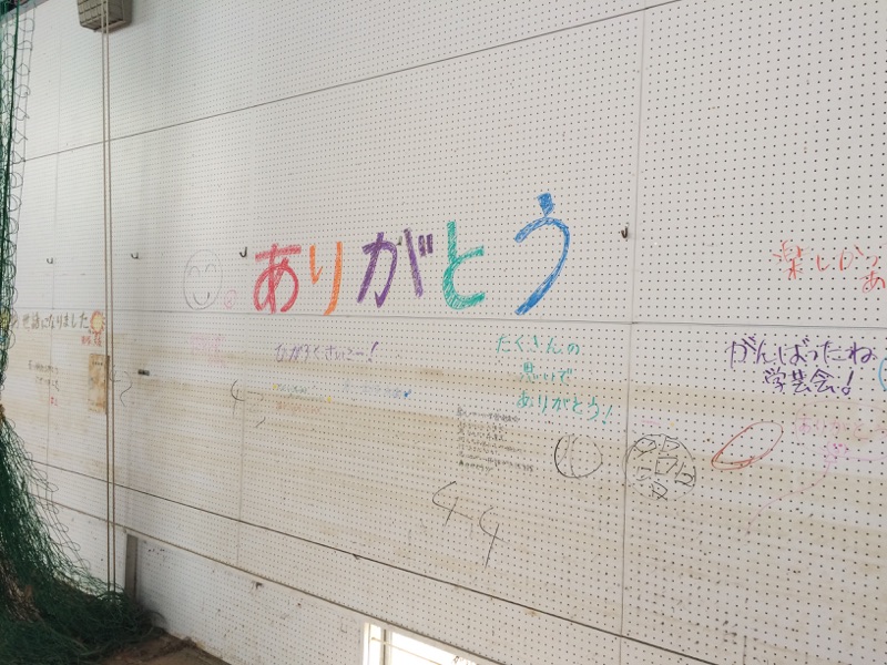 体育館の壁にはたくさんのメッセージが書かれていました。