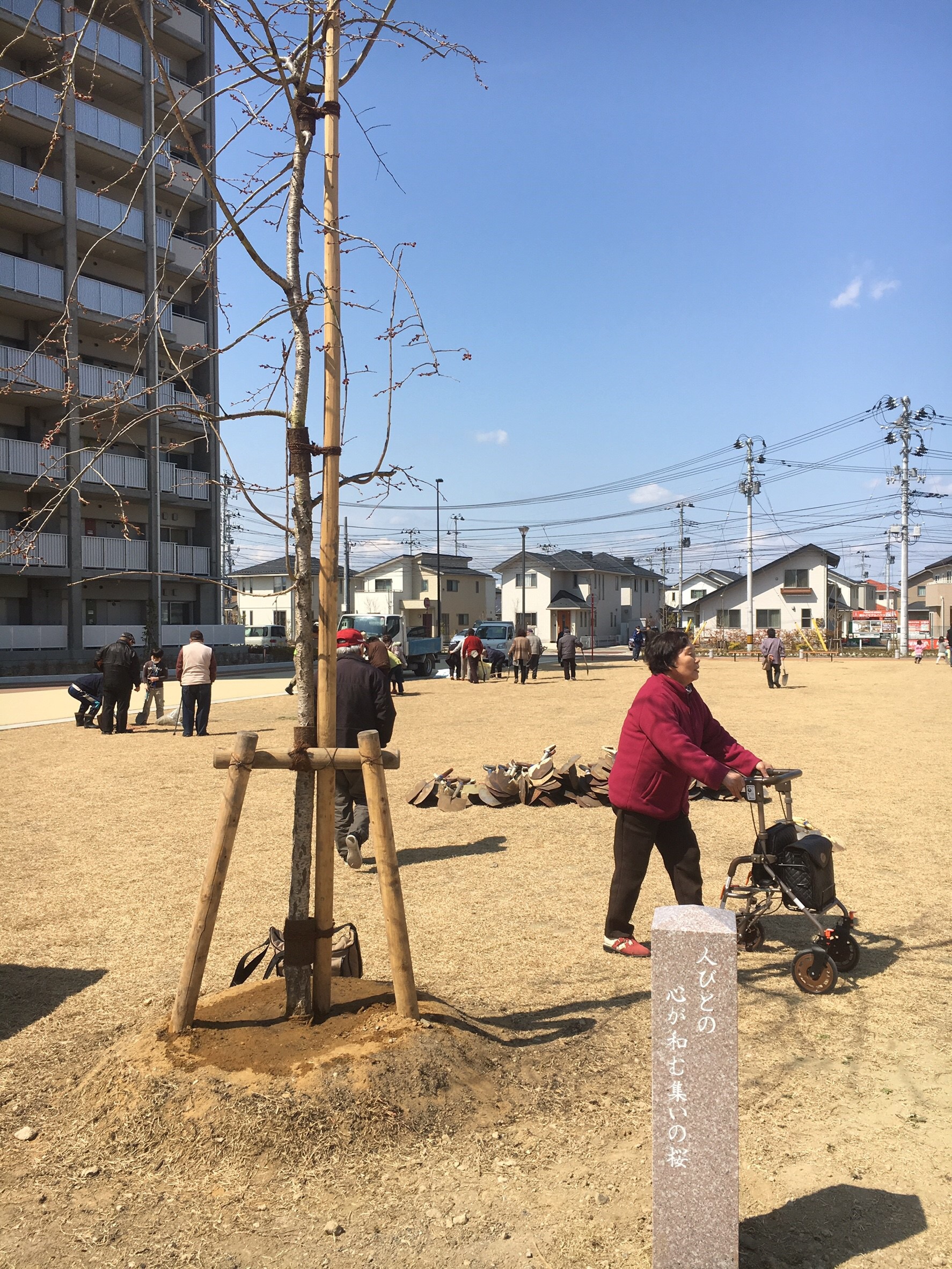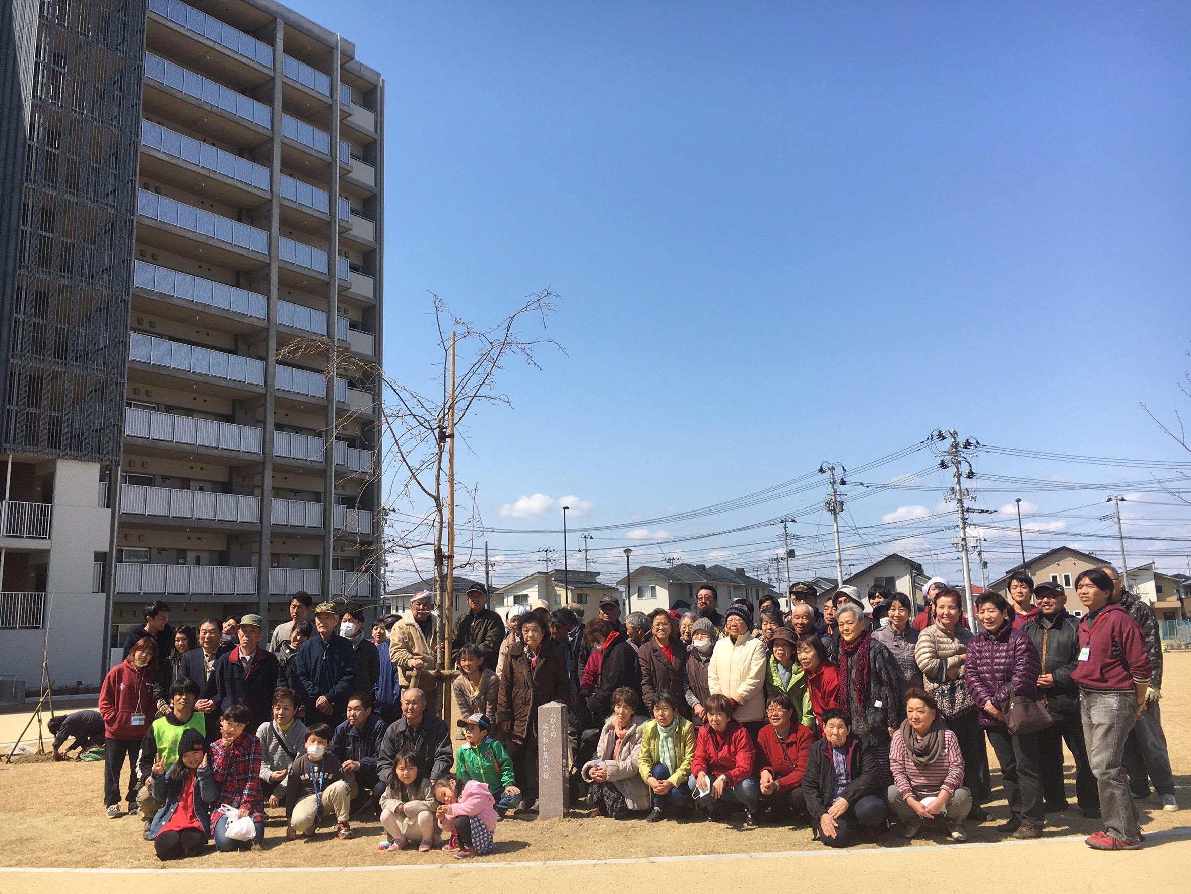 桜と一緒に「人びとの 心が和む集いの桜」という言葉が刻まれた記念碑が立てられました。これは、荒井東復興公営住宅に住んでいる住民の方からの応募の中から決められました!