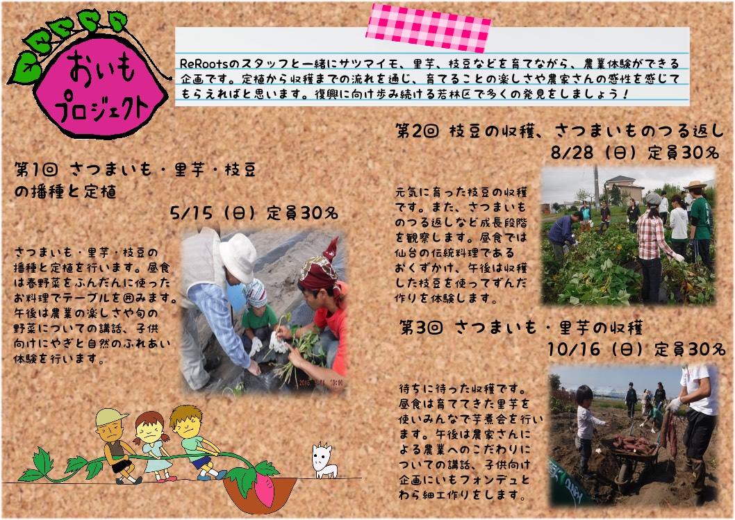 おいもプロジェクトは、2013年に始まった企画で、5月にさつまいもの苗を植えてから秋の収穫までの生育管理を若林区を訪れる参加者とともに行い、若林区の復興や農業の魅力を肌で感じてもらおうと始まった企画です。