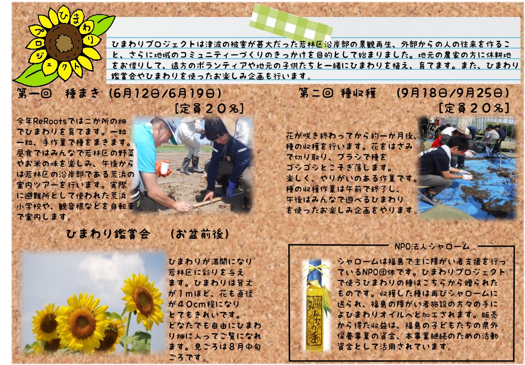 もうひとつは、人の往来作り、コミュニティー再生を目的とした「ひまわりプロジェクト」です。地元の農家の方に休耕地をお借りして、遠方のボランティアや地元の子供たちと一緒にひまわりを植え、育てます。また、ひまわり鑑賞会やひまわりを使ったお楽しみ企画も行いますので、小さいお子さんでも大歓迎です。