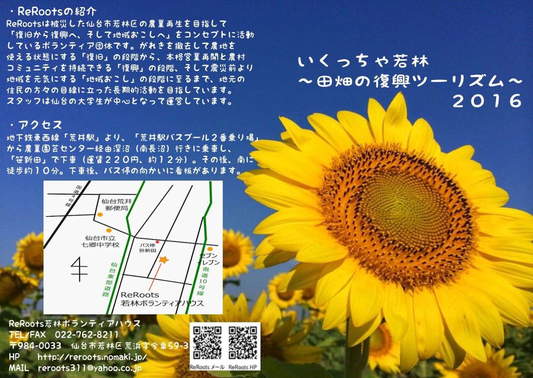 ReRootsは、東日本大震災による津波被災地の復旧から復興、更には地域おこしにむけて、仙台市若林区のボランティアハウスを拠点に活動する団体です。