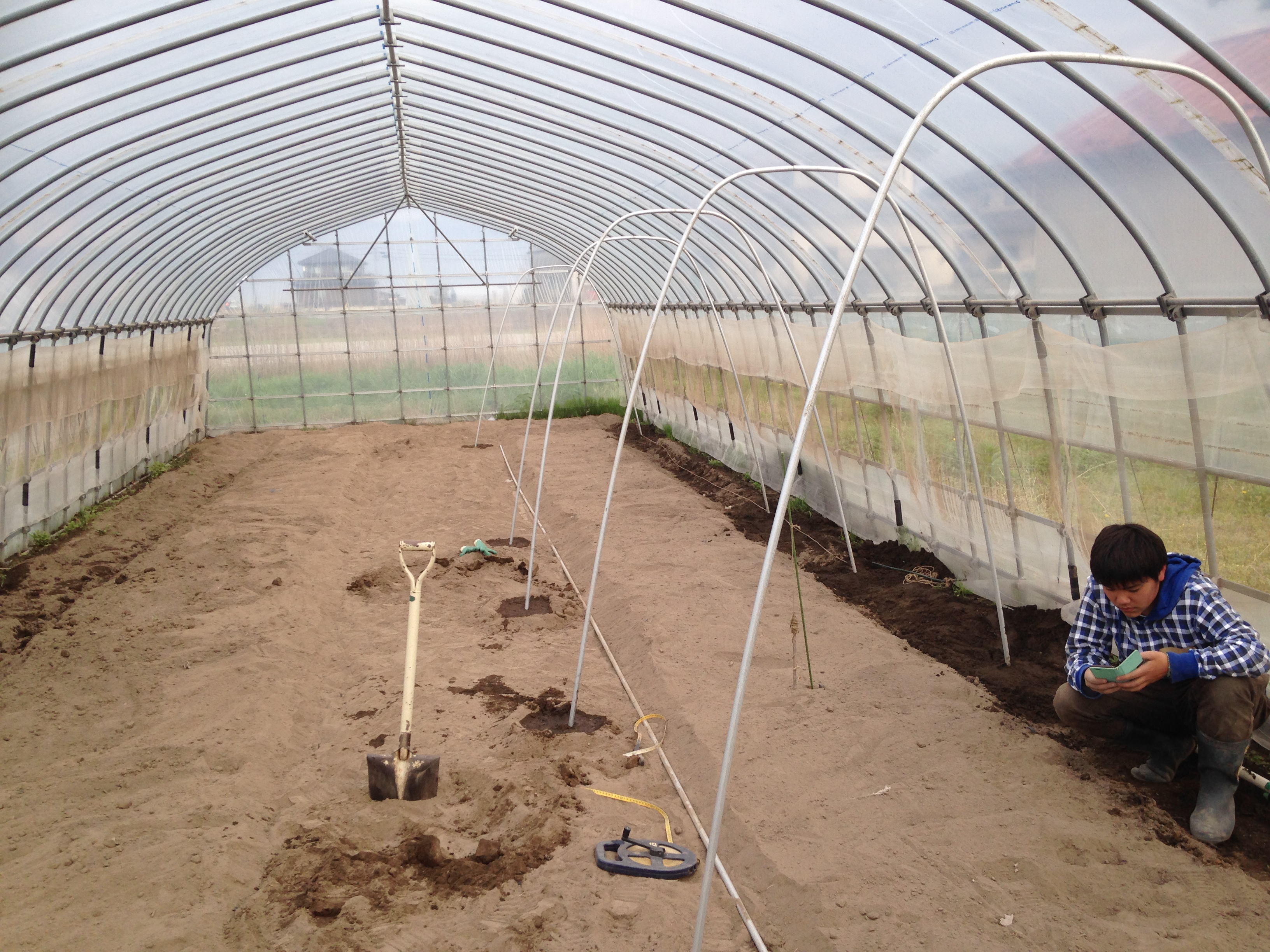 というわけで外での作業を断念し、ビニールハウス内のトマト区画の畝たて支柱たてをしました。