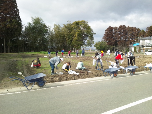 今日は畑の土おこしとガレキ拾いです。