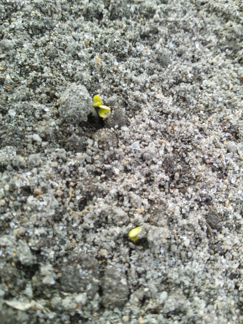 まだ全体としては芽はほとんど見えないのですが、ところどころ、気の早い種がお日様と出会いました。