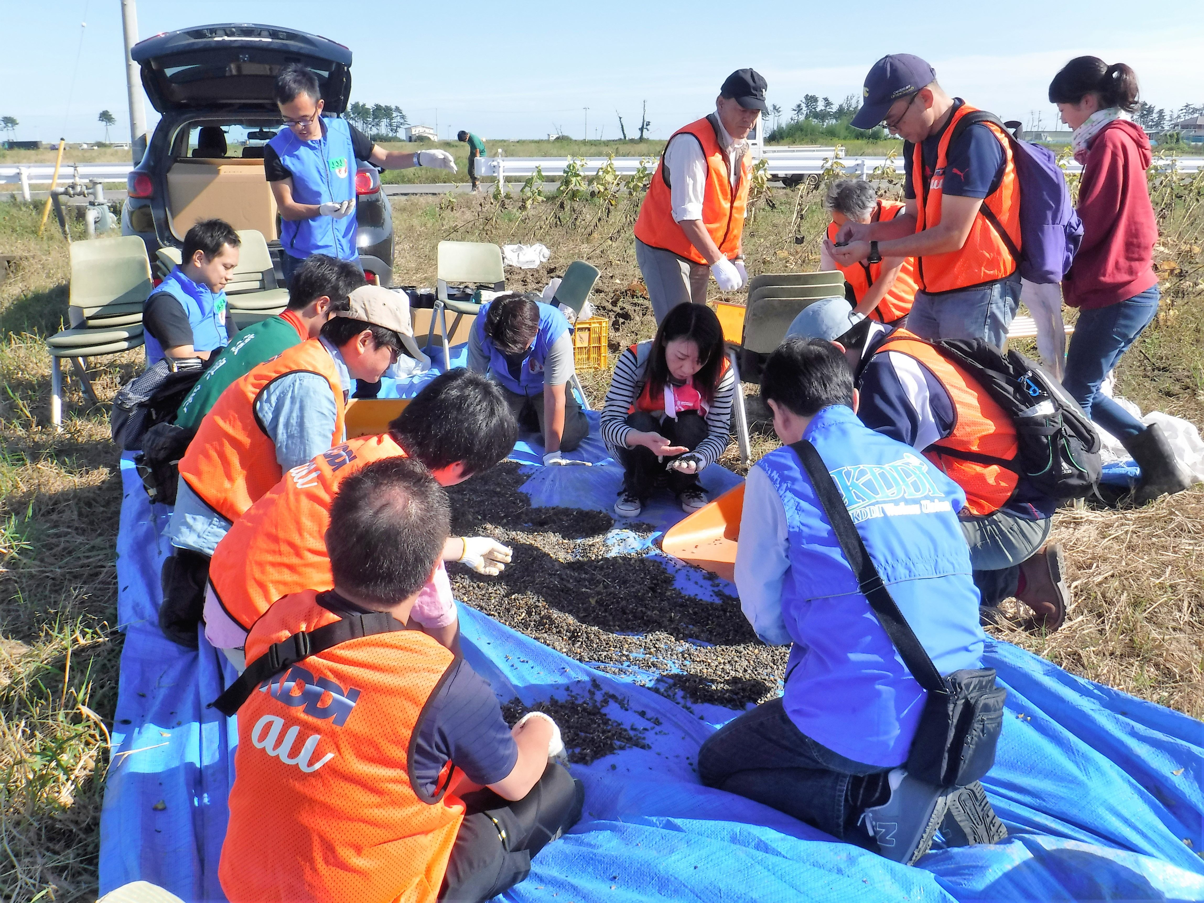 10月2日、KDDI株式会社東北総支社さんとKDDI労働組合東日本支部さんと一緒にボランティア活動としてひまわりの種のこそぎ落としを行いました。