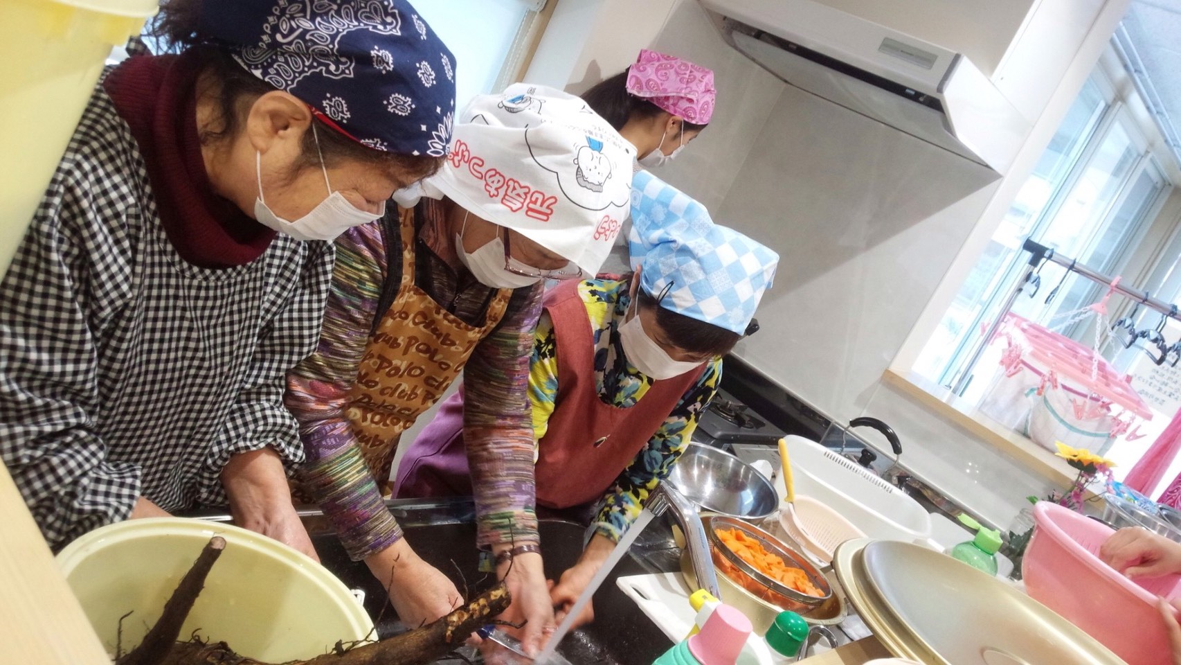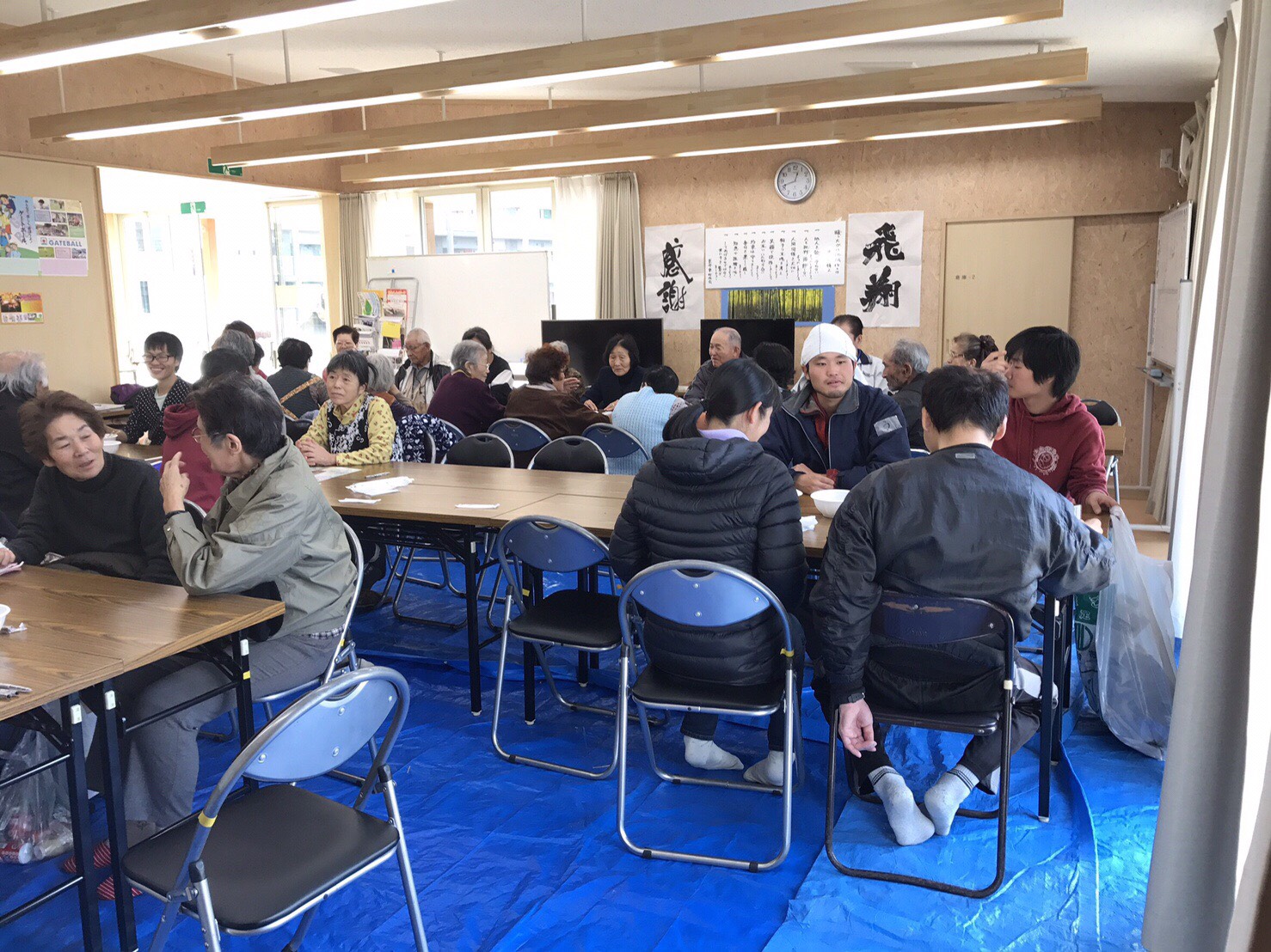 今回の企画は荒井東復興公営住宅にお住いの主婦の方々に、芋煮の作り方を教わりながら作りました。下の写真はその様子です。調理の手伝いに朝早くから集まっていただき本当にありがとうございました!