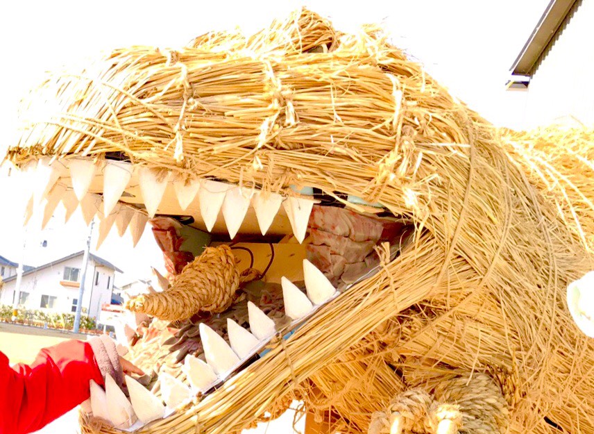 わらといえば、仙台市農業園芸センターにて巨大わらアートが展示されていますが、この日はセンターの入り口にいる子ティラノサウルスが集会所に登場!!