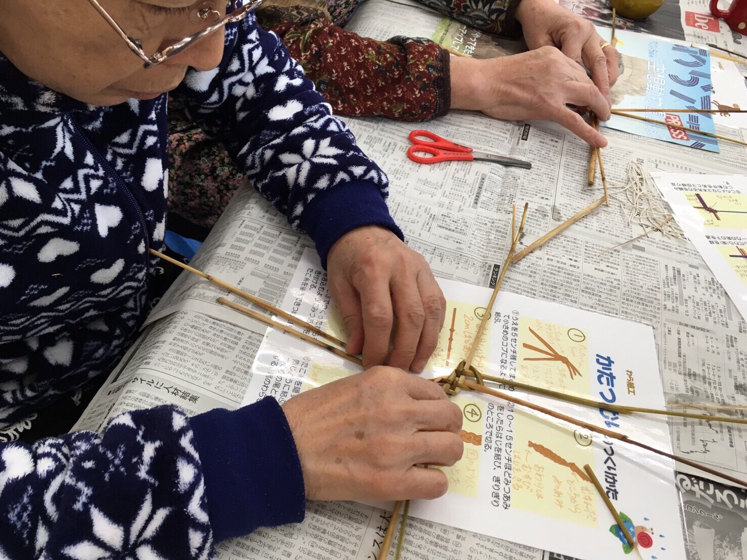 馬とかたつむりを作るのですが、なかなか細かな作業に悪戦苦闘する方が多く、「難しいね~」と笑いながらお話されていました。中には小さいころにわらでよく遊んだという方もいらっしゃり、その見事な手つきに周りから感嘆の声があがりました。