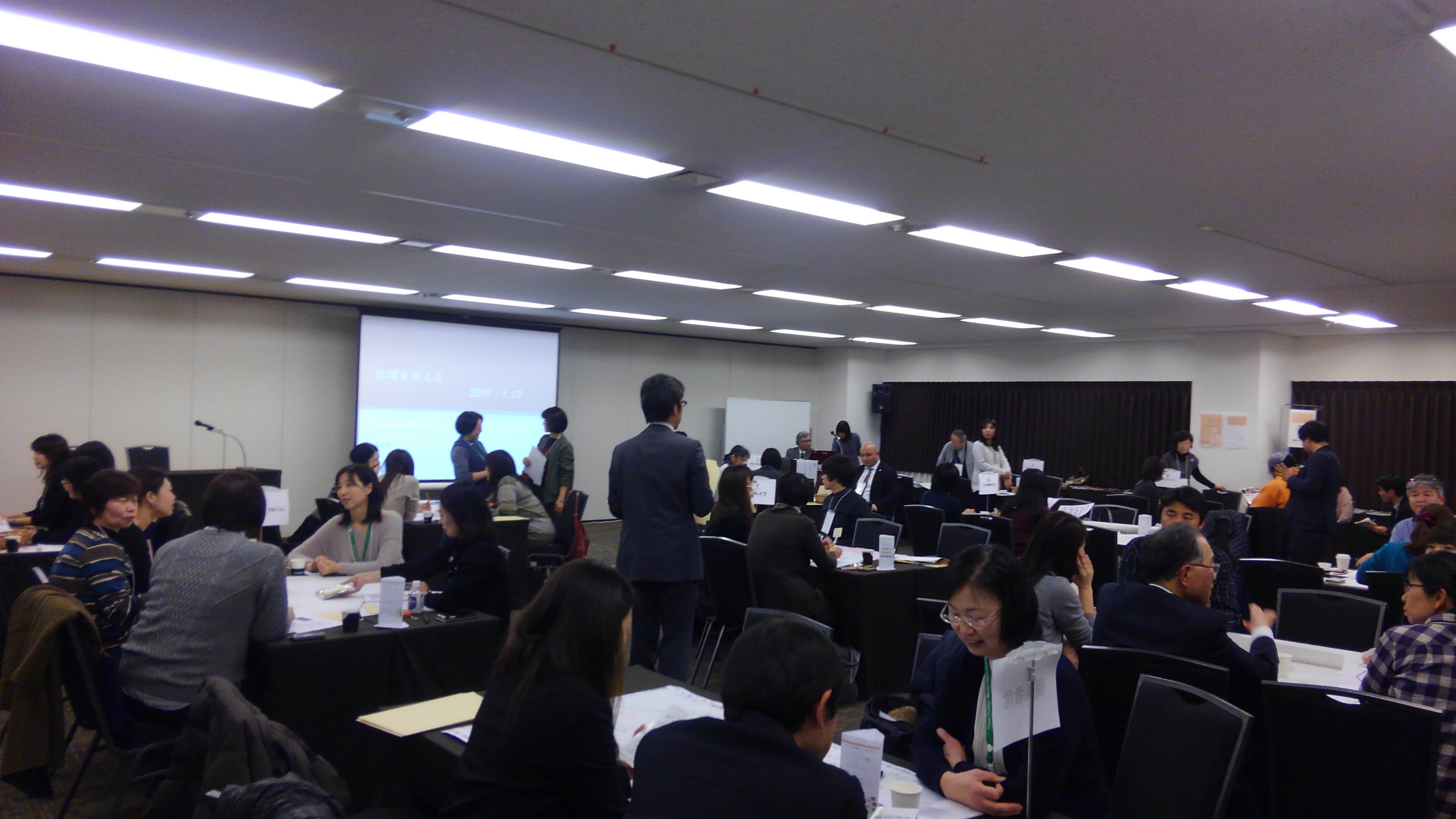 ワールドカフェの様子。いろんなテーブルでつながり作りについて話しています。