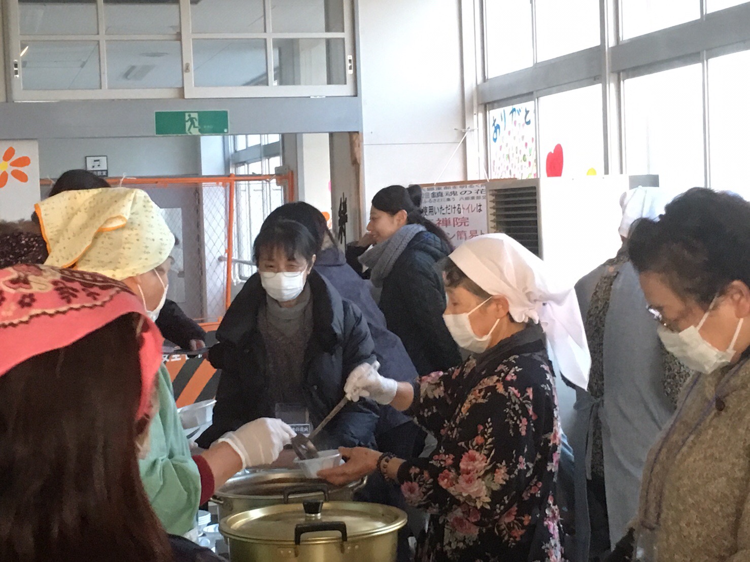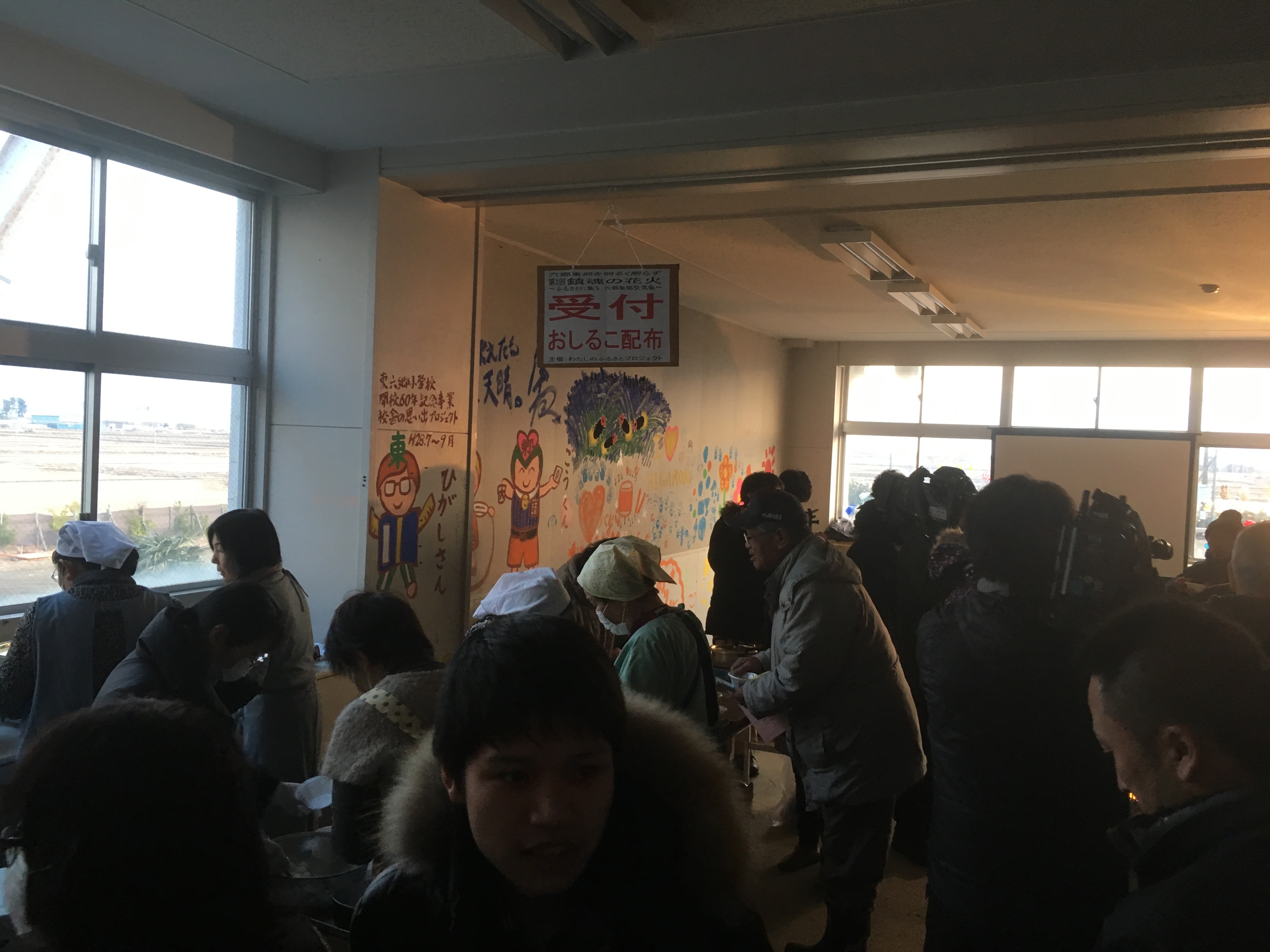 当日、東六郷小学校の校内は多くの来場者でいっぱいになりました。地域コミュニティの中心であった小学校への想いの深さが感じられます。地元のお母さん方による、おしるこ配布も行われました。500食分用意していたおしるこは1時間半ほどで全て配り終えてしまいました。お客さんからの評判も大変よかったです。
