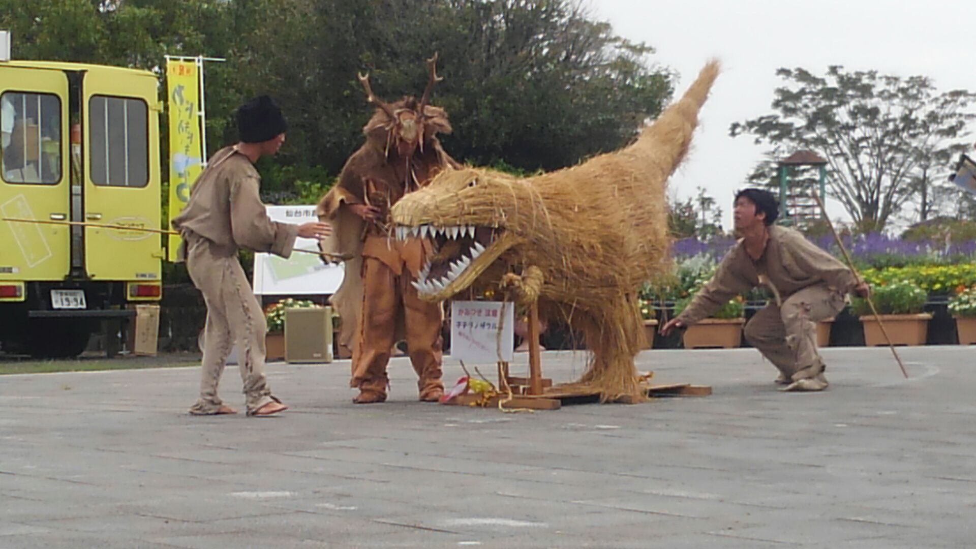 ちょうど、わらアートの小ティラノサウルスも持っていって、復興のために、わらを使ってアート作品にして人を呼び込む実演もしてきました。